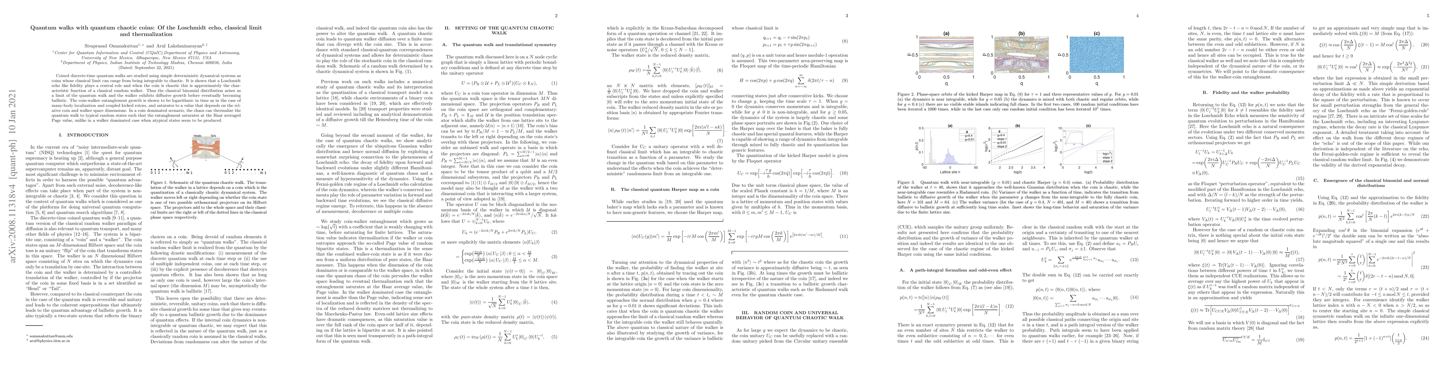 Coined discrete-time quantum walks are studied using simple deterministic dynamical systems as coins whose classical limit can range from being integrable to chaotic. It is shown that a Loschmidt echo like fidelity plays a central role and when the coin is chaotic this is approximately the characteristic function of a classical random walker. Thus the classical binomial distribution arises as a limit of the quantum walk and the walker exhibits diffusive growth before eventually becoming ballistic. The coin-walker entanglement growth is shown to be logarithmic in time as in the case of many-body localization and coupled kicked rotors, and saturates to a value that depends on the relative coin and walker space dimensions. In a coin dominated scenario, the chaos can thermalize the quantum walk to typical random states such that the entanglement saturates at the Haar averaged Page value, unlike in a walker dominated case when atypical states seem to be produced.