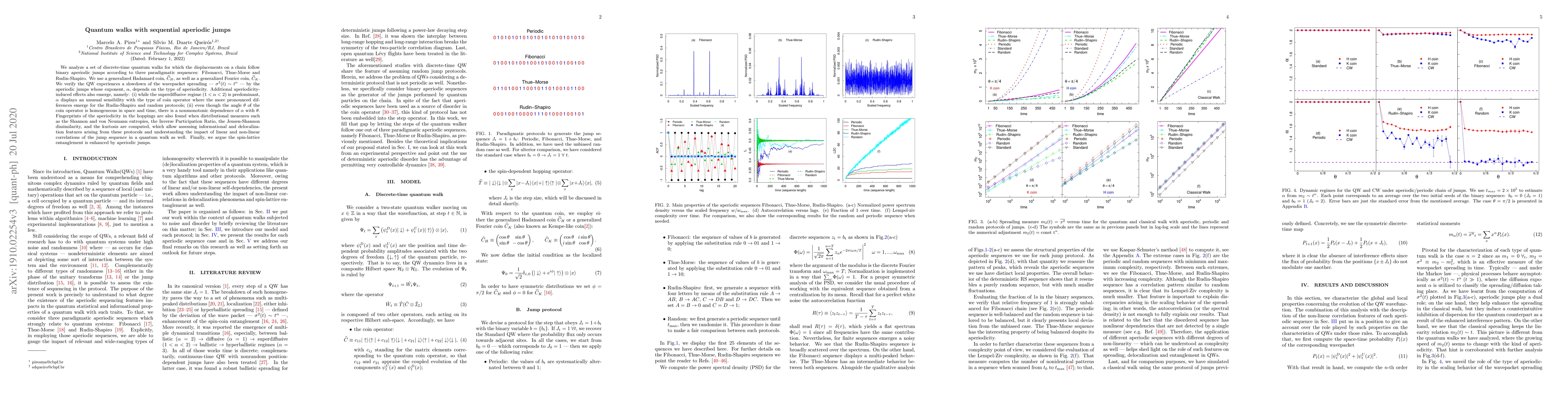 This paper investigates quantum walks on a chain where the displacements follow binary aperiodic sequences like Fibonacci, Thue-Morse, and Rudin-Shapiro, revealing a slowdown in wavepacket spreading dependent on the sequence type. The study also shows that entanglement is enhanced by these aperiodic jumps, with varying sensitivity to the type of coin operator used.