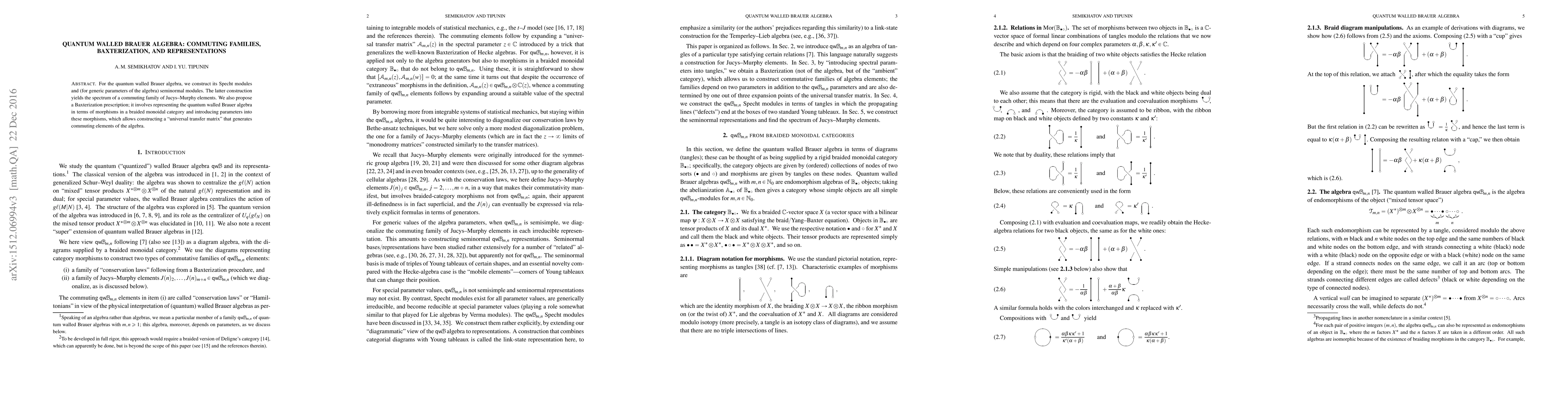 This paper constructs Specht and seminormal modules for the quantum walled Brauer algebra, establishing a spectrum of commuting Jucys-Murphy elements. It also introduces a Baxterization technique that represents the algebra in a braided monoidal category, facilitating the construction of a universal transfer matrix.