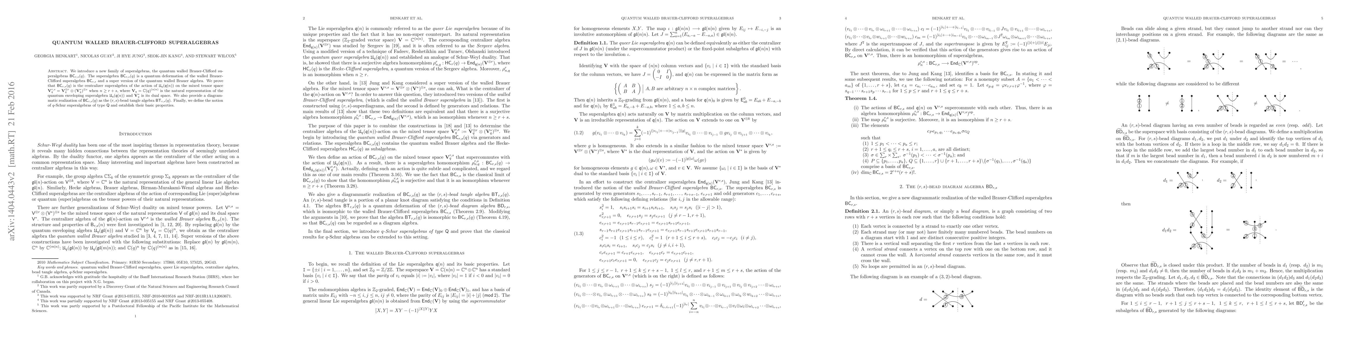 We introduce a new family of superalgebras, the quantum walled Brauer-Clifford superalgebras ${\mathsf {BC}}_{r,s}(q)$. The superalgebra ${\mathsf {BC}}_{r,s}(q)$ is a quantum deformation of the walled Brauer-Clifford superalgebra ${\mathsf {BC}}_{r,s}$ and a super version of the quantum walled Brauer algebra. We prove that ${\mathsf {BC}}_{r,s}(q)$ is the centralizer superalgebra of the action of ${\mathfrak U}_{q}({\mathfrak q}(n))$ on the mixed tensor space $\mathbf{V}_{q}^{r,s}=\mathbf{V}_{q}^{\otimes r} \otimes (\mathbf{V}_q^*)^{\otimes s}$ when $n \ge r+s$, where ${\mathbf V}_{q}=\mathbb{C}(q)^{(n|n)}$ is the natural representation of the quantum enveloping superalgebra ${\mathfrak U}_{q}({\mathfrak q}(n))$ and $\mathbf{V}_q^*$ is its dual space. We also provide a diagrammatic realization of ${\mathsf {BC}}_{r,s}(q)$ as the $(r,s)$-bead tangle algebra ${\mathsf {BT}}_{r,s}(q)$. Finally, we define the notion of $q$-Schur superalgebras of type $\mathsf{Q}$ and establish their basic properties.