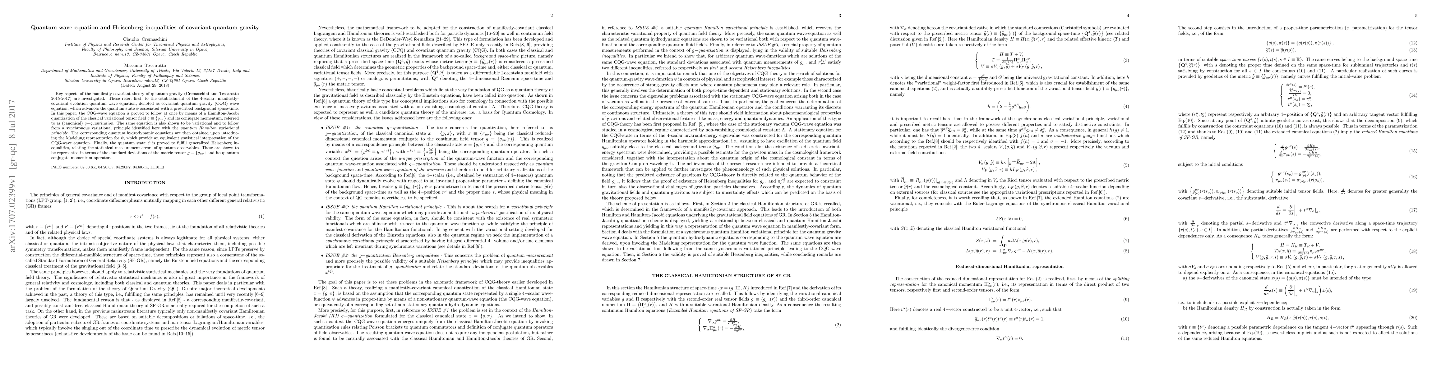 Key aspects of the manifestly-covariant theory of quantum gravity (Cremaschini and Tessarotto 2015-2017) are investigated. These refer, first, to the establishment of the 4-scalar, manifestly-covariant evolution quantum wave equation, denoted as covariant quantum gravity (CQG) wave equation, which advances the quantum state $\psi $ associated with a prescribed background space-time. In this paper, the CQG-wave equation is proved to follow at once by means of a Hamilton-Jacobi quantization of the classical variational tensor field $g\equiv \left\{ g_{\mu \nu }\right\} $ and its conjugate momentum, referred to as (canonical) $g-$quantization. The same equation is also shown to be variational and to follow from a synchronous variational principle identified here with the quantum Hamilton variational principle. The corresponding quantum hydrodynamic equations are then obtained upon introducing the Madelung representation for $\psi $, which provide an equivalent statistical interpretation of the CQG-wave equation. Finally, the quantum state $\psi $ is proved to fulfill generalized Heisenberg inequalities, relating the statistical measurement errors of quantum observables. These are shown to be represented in terms of the standard deviations of the matric tensor $g\equiv \left\{ g_{\mu \nu }\right\} $ and its quantum conjugate momentum operator.