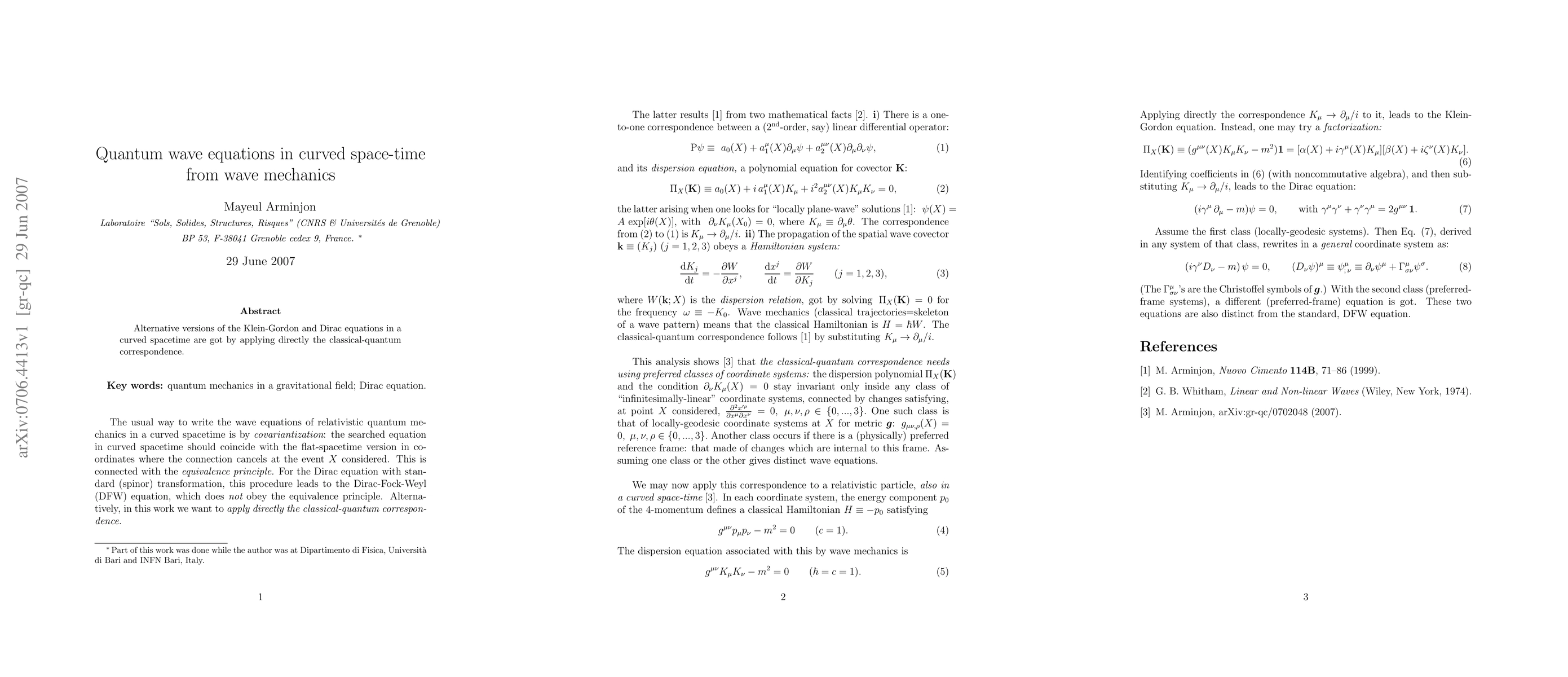 Summary: This paper explores alternative formulations of the Klein-Gordon and Dirac equations in curved spacetime by applying classical-quantum correspondence principles, offering new perspectives on quantum wave mechanics in such environments.