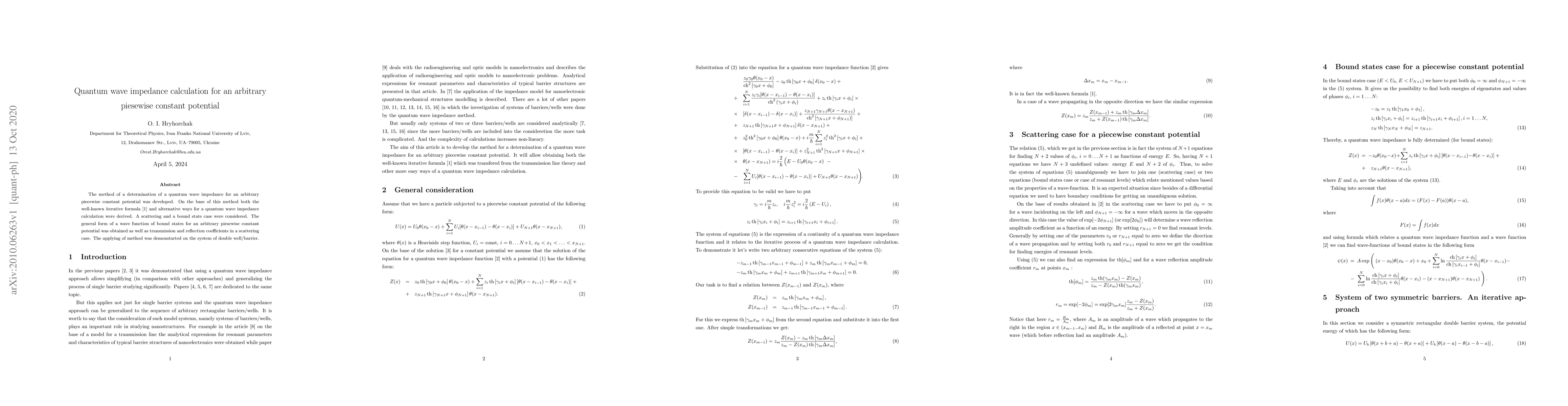 This paper develops a method for determining quantum wave impedance in an arbitrary piecewise constant potential, deriving both iterative formulas and alternative calculation approaches. It also provides the general form of bound state wave functions and transmission/reflection coefficients, demonstrated through a double well/barrier system.