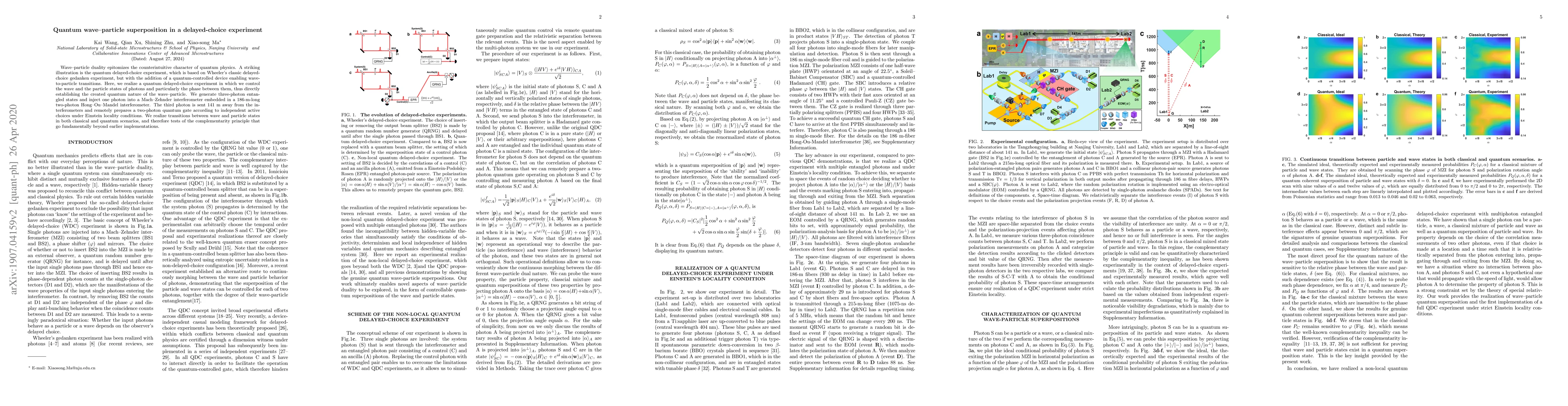 Wave-particle duality epitomizes the counterintuitive character of quantum physics. A striking illustration is the quantum delay-choice experiment, which is based on Wheeler's classic delayed-choice gedanken experiment, but with the addition of a quantum-controlled device enabling wave-to-particle transitions. Here we realize a quantum delayed-choice experiment in which we control the wave and the particle states of photons and in particular the phase between them, thus directly establishing the created quantum nature of the wave-particle. We generate three-photon entangled states and inject one photon into a Mach--Zehnder interferometer embedded in a 187-m-long two-photon Hong-Ou-Mandel interferometer. The third photon is sent 141m away from the interferometers and remotely prepares a two-photon quantum gate according to independent active choices under Einstein locality conditions. We have realized transitions between wave and particle states in both classical and quantum scenarios, and therefore tests of the complementarity principle that go fundamentally beyond earlier implementations.