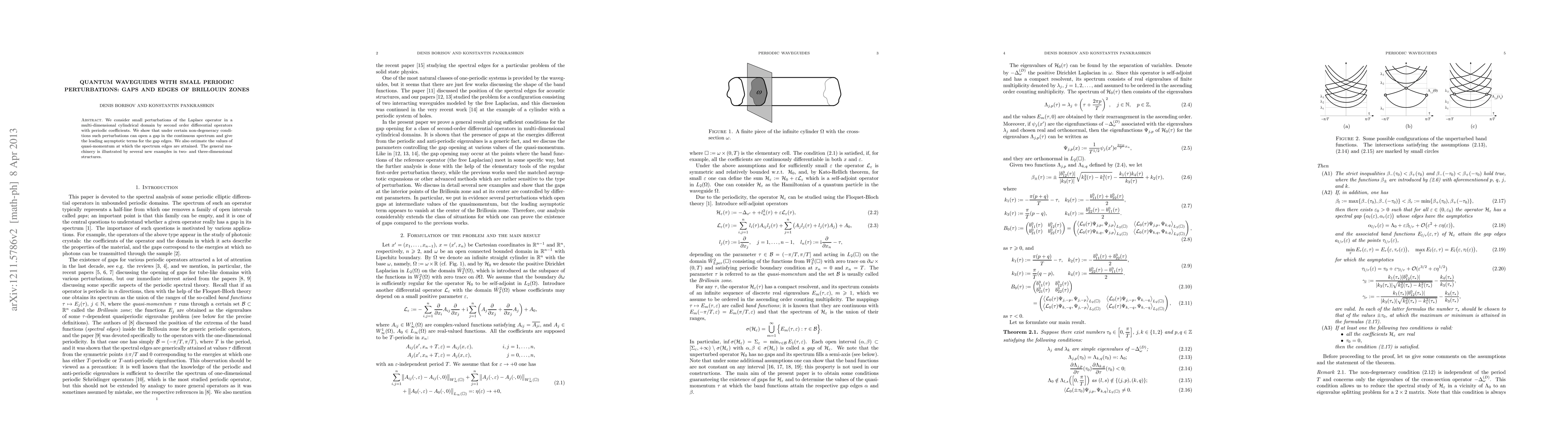 This paper investigates how small periodic perturbations in quantum waveguides affect the Laplace operator's spectrum, demonstrating that these perturbations can create gaps in the continuous spectrum and providing asymptotic estimates for the gap edges and quasi-momentum values. Examples in two- and three-dimensional structures illustrate the general findings.