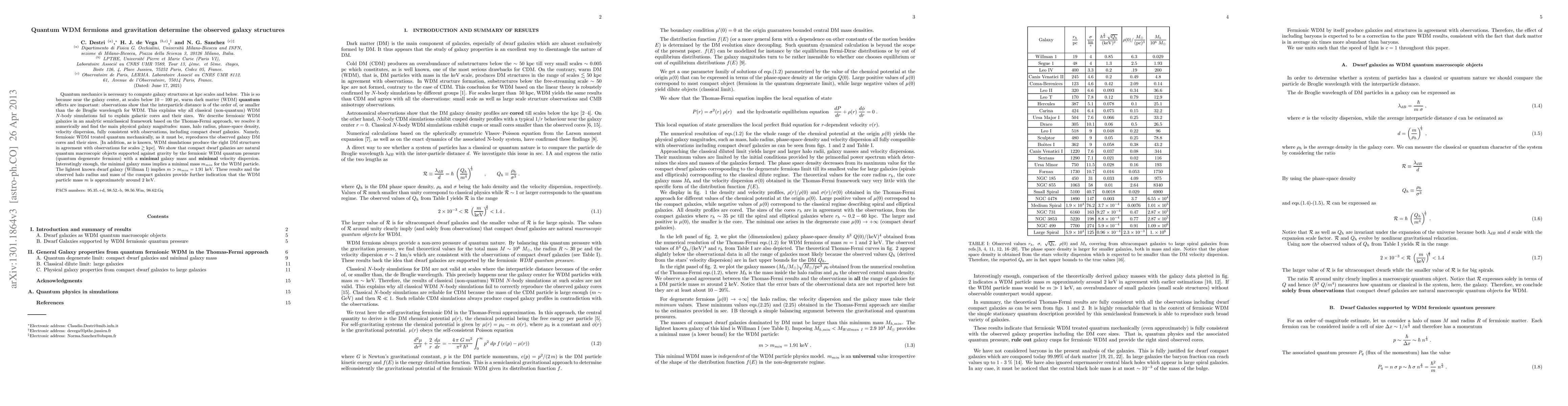 Quantum mechanics is necessary to compute galaxy structures at kpc scales and below. This is so because near the galaxy center, at scales below 10 - 100 pc, warm dark matter (WDM) quantum effects are important: observations show that the interparticle distance is of the order of, or smaller than the de Broglie wavelength for WDM. This explains why all classical (non-quantum) WDM N-body simulations fail to explain galactic cores and their sizes. We describe fermionic WDM galaxies in an analytic semiclassical framework based on the Thomas-Fermi approach, we resolve it numerically and find the main physical galaxy magnitudes: mass, halo radius, phase-space density, velocity dispersion, fully consistent with observations, including compact dwarf galaxies. Namely, fermionic WDM treated quantum mechanically, as it must be, reproduces the observed galaxy DM cores and their sizes. [In addition, as is known, WDM simulations produce the right DM structures in agreement with observations for scales > kpc]. We show that compact dwarf galaxies are natural quantum macroscopic objects supported against gravity by the fermionic WDM quantum pressure (quantum degenerate fermions) with a minimal galaxy mass and minimal velocity dispersion. Interestingly enough, the minimal galaxy mass implies a minimal mass m_{min} for the WDM particle. The lightest known dwarf galaxy (Willman I) implies m > m_{min} = 1.91 keV. These results and the observed halo radius and mass of the compact galaxies provide further indication that the WDM particle mass m is approximately around 2 keV.