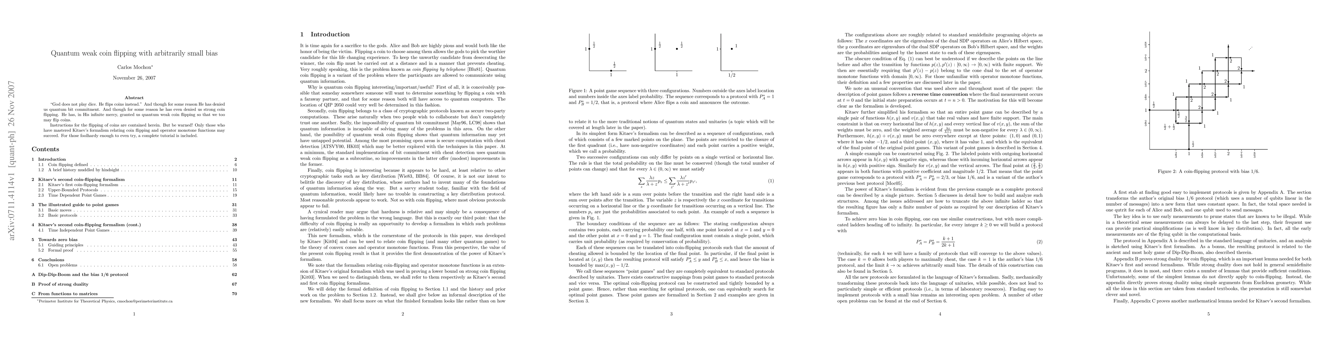This paper presents a method for quantum weak coin flipping with an arbitrarily small bias, enabling coin flipping protocols in quantum mechanics. It provides a detailed tutorial for those familiar with Kitaev's formalism to implement these protocols, despite the inherent limitations in achieving perfect randomness.