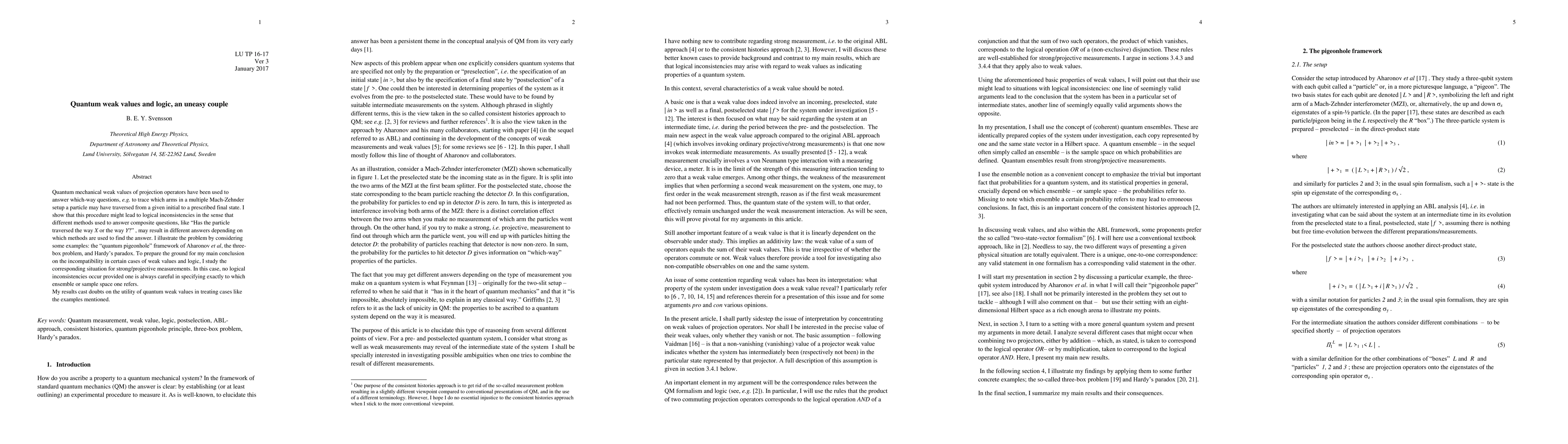 This paper explores the logical inconsistencies that may arise when using quantum weak values to answer composite questions, demonstrating that different methods can yield different results. The study highlights the incompatibility of weak values with logic in certain scenarios, contrasting with the consistency found in strong/projective measurements.