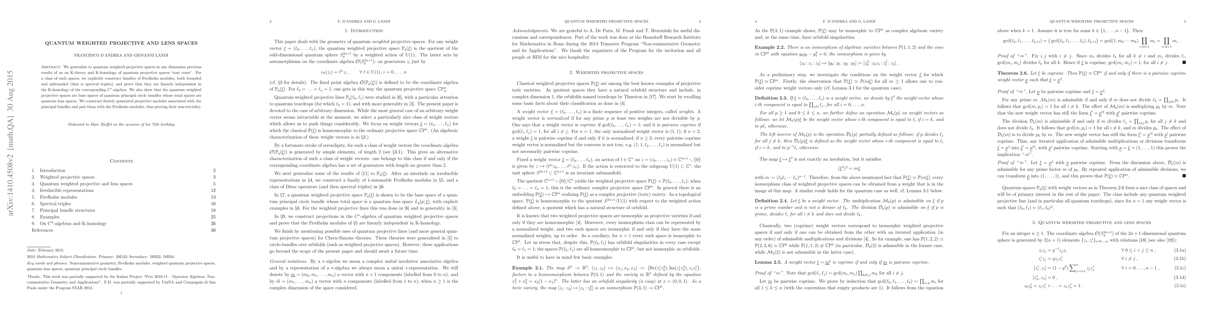 This paper generalizes prior results on K-theory and K-homology for quantum projective spaces to quantum weighted projective spaces, constructing spectral triples and proving their linear independence in K-homology. It also demonstrates that these spaces serve as bases for quantum principal circle bundles, with corresponding quantum lens spaces, and verifies their non-triviality through projective module pairings.