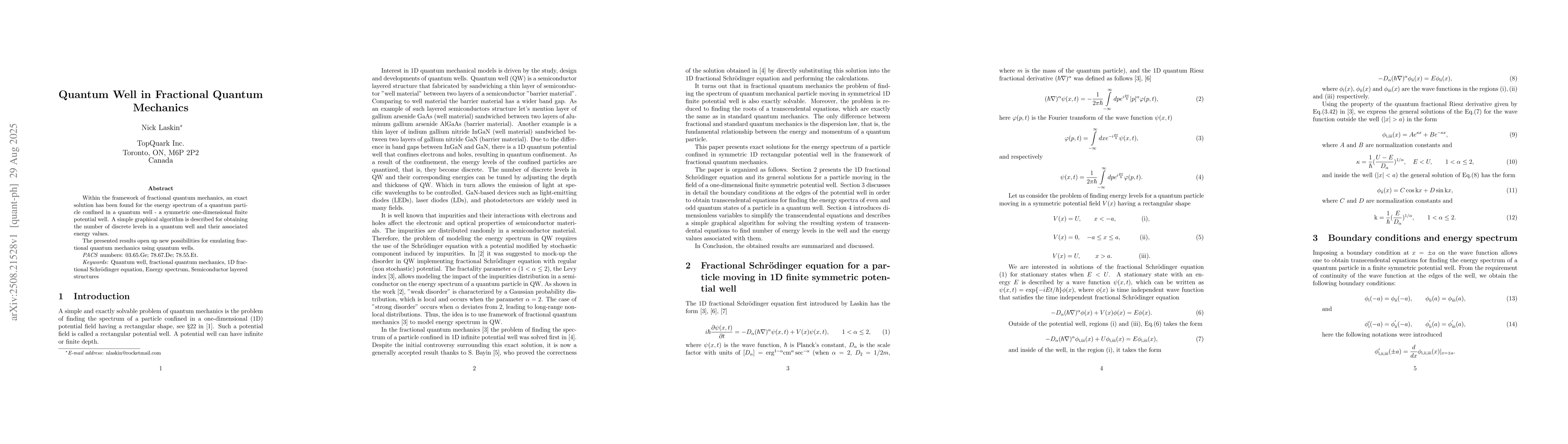 Within the framework of fractional quantum mechanics, an exact solution has been found for the energy spectrum of a quantum particle confined in a quantum well - a symmetric one-dimensional finite potential well. A simple graphical algorithm is described for obtaining the number of discrete levels in a quantum well and their associated energy values. The presented results open up new possibilities for emulating fractional quantum mechanics using quantum wells.