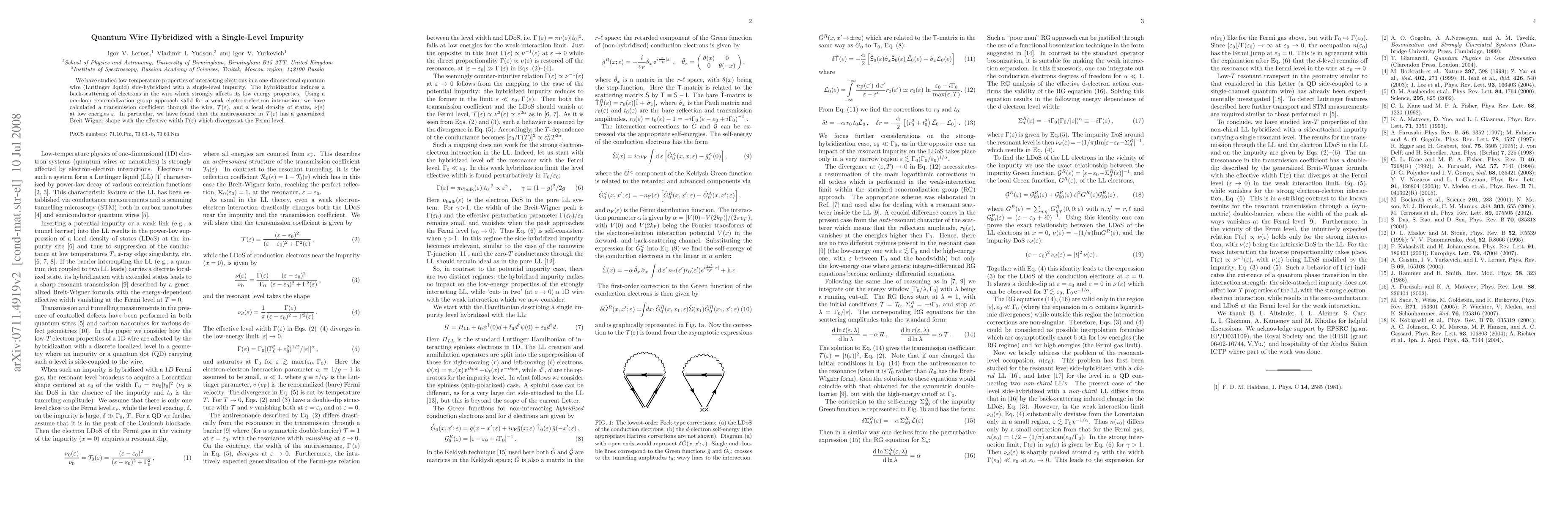 This paper investigates the low-temperature behavior of a one-dimensional quantum wire hybridized with a single-level impurity, revealing significant electron back-scattering effects. The study employs a one-loop renormalization group method to calculate the transmission coefficient and local density of states, finding an antiresonance with a generalized Breit-Wigner shape whose width diverges at the Fermi level.