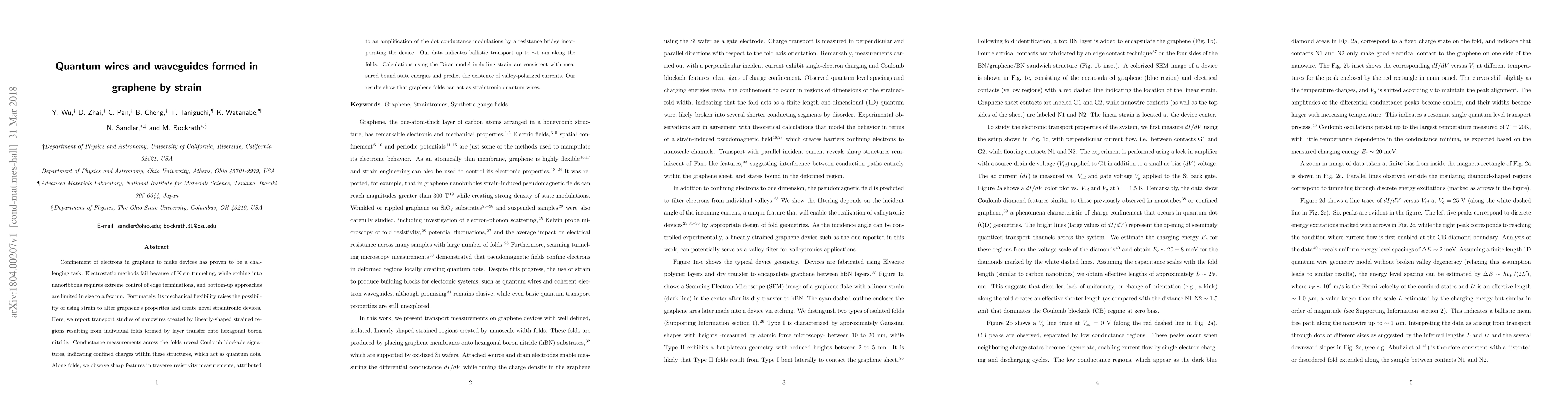 This paper demonstrates the creation of quantum wires in graphene using strain-induced folds on hexagonal boron nitride, showing ballistic transport and Coulomb blockade signatures, and predicting valley-polarized currents via Dirac model calculations.