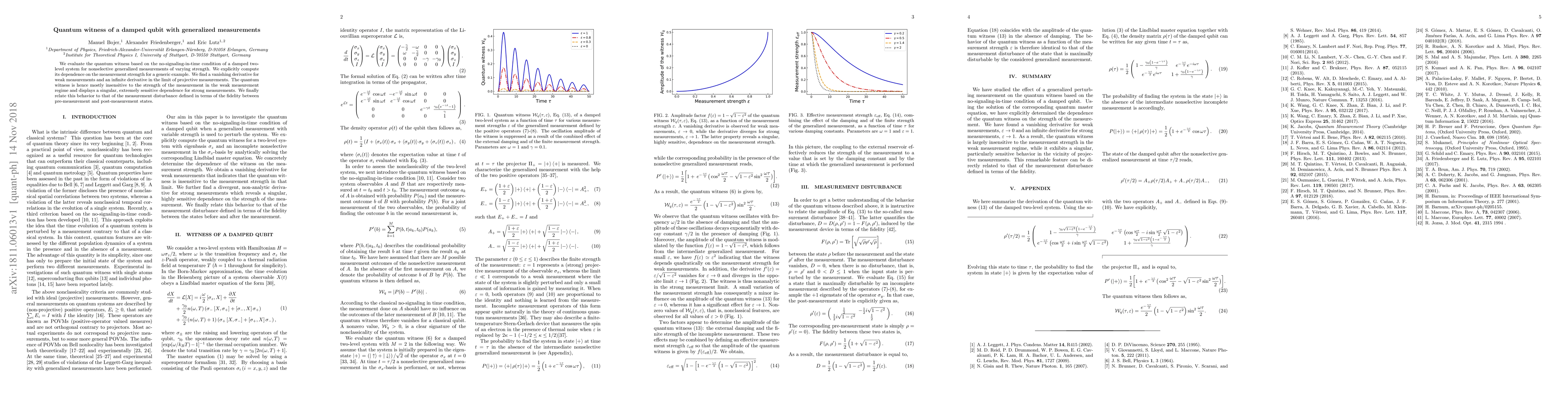 We evaluate the quantum witness based on the no-signaling-in-time condition of a damped two-level system for nonselective generalized measurements of varying strength. We explicitly compute its dependence on the measurement strength for a generic example. We find a vanishing derivative for weak measurements and an infinite derivative in the limit of projective measurements. The quantum witness is hence mostly insensitive to the strength of the measurement in the weak measurement regime and displays a singular, extremely sensitive dependence for strong measurements. We finally relate this behavior to that of the measurement disturbance defined in terms of the fidelity between pre-measurement and post-measurement states.