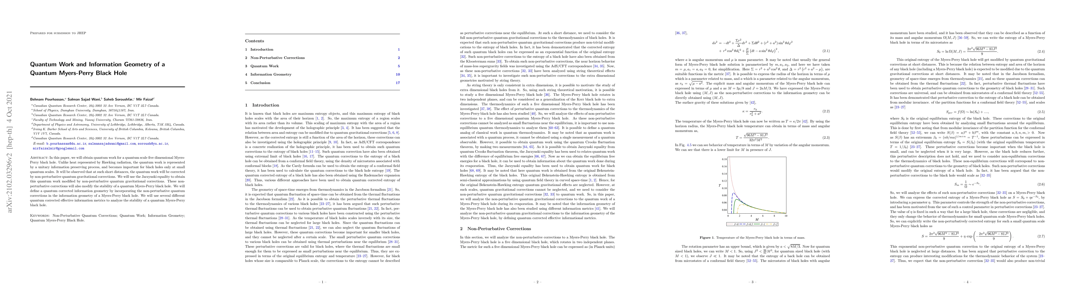In this paper, we will obtain quantum work for a quantum scale five dimensional Myers-Perry black hole. Unlike heat represented by Hawking radiation, the quantum work is represented by a unitary information preserving process, and becomes important for black holes only at small quantum scales. It will be observed that at such short distances, the quantum work will be corrected by non-perturbative quantum gravitational corrections. We will use the Jarzynski equality to obtain this quantum work modified by non-perturbative quantum gravitational corrections. These non-perturbative corrections will also modify the stability of a quantum Myers-Perry black hole. We will define a quantum corrected information geometry by incorporating the non-perturbative quantum corrections in the information geometry of a Myers-Perry black hole. We will use several different quantum corrected effective information metrics to analyze the stability of a quantum Myers-Perry black hole.