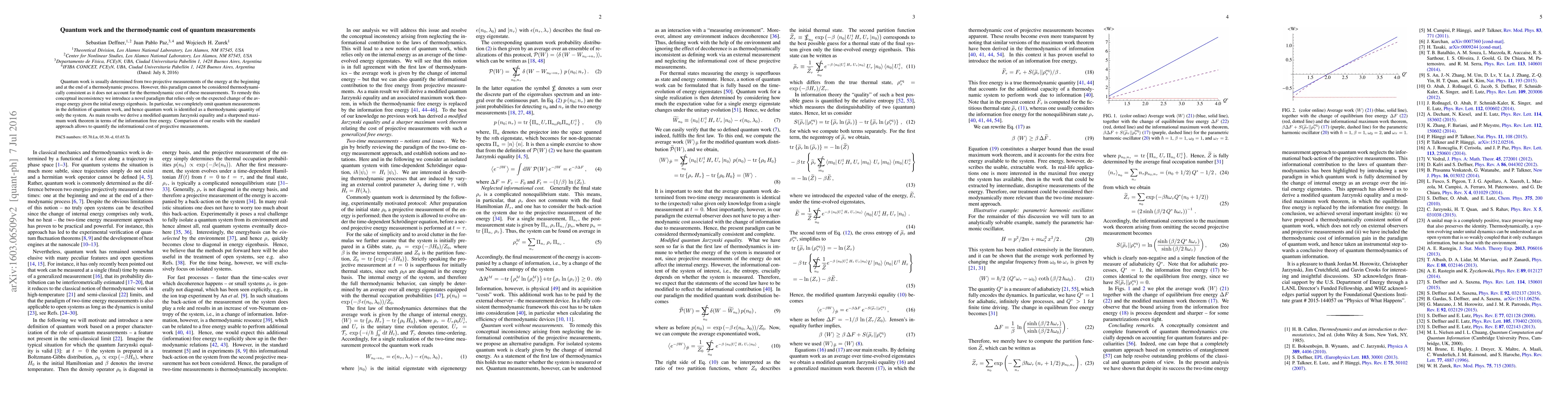 Quantum work is usually determined from two projective measurements of the energy at the beginning and at the end of a thermodynamic process. However, this paradigm cannot be considered thermodynamically consistent as it does not account for the thermodynamic cost of these measurements. To remedy this conceptual inconsistency we introduce a novel paradigm that relies only on the expected change of the average energy given the initial energy eigenbasis. In particular, we completely omit quantum measurements in the definition of quantum work, and hence quantum work is identified as a thermodynamic quantity of only the system. As main results we derive a modified quantum Jarzynski equality and a sharpened maximum work theorem in terms of the information free energy. Comparison of our results with the standard approach allows to quantify the informational cost of projective measurements.