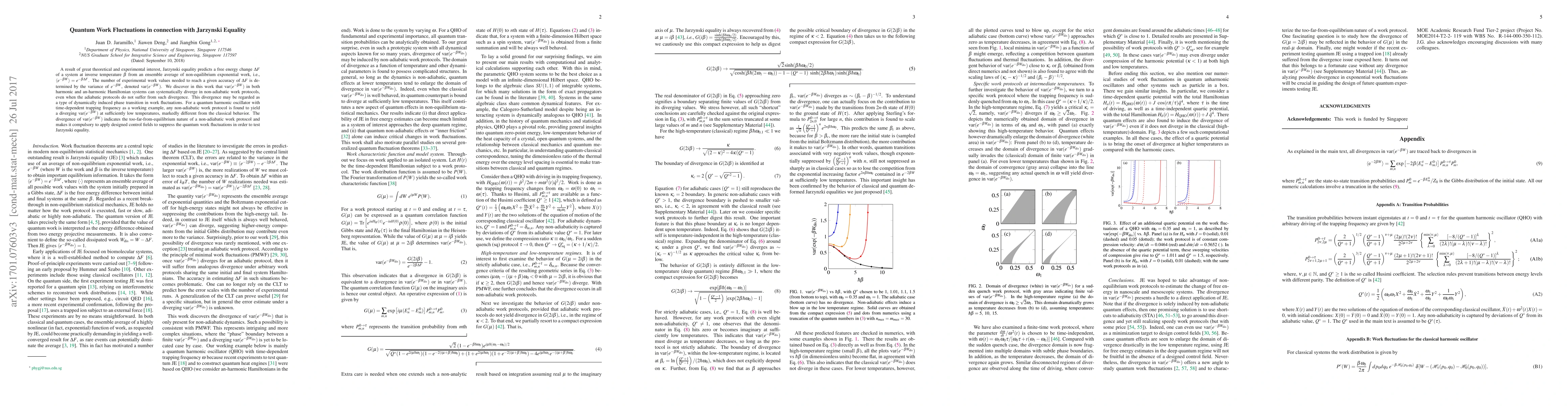 This paper explores the divergence of quantum work fluctuations in non-adiabatic protocols, revealing that the variance of $e^{-\beta W}$ can diverge in quantum systems at low temperatures, unlike classical systems. This divergence necessitates control fields to suppress fluctuations for testing Jarzynski equality.