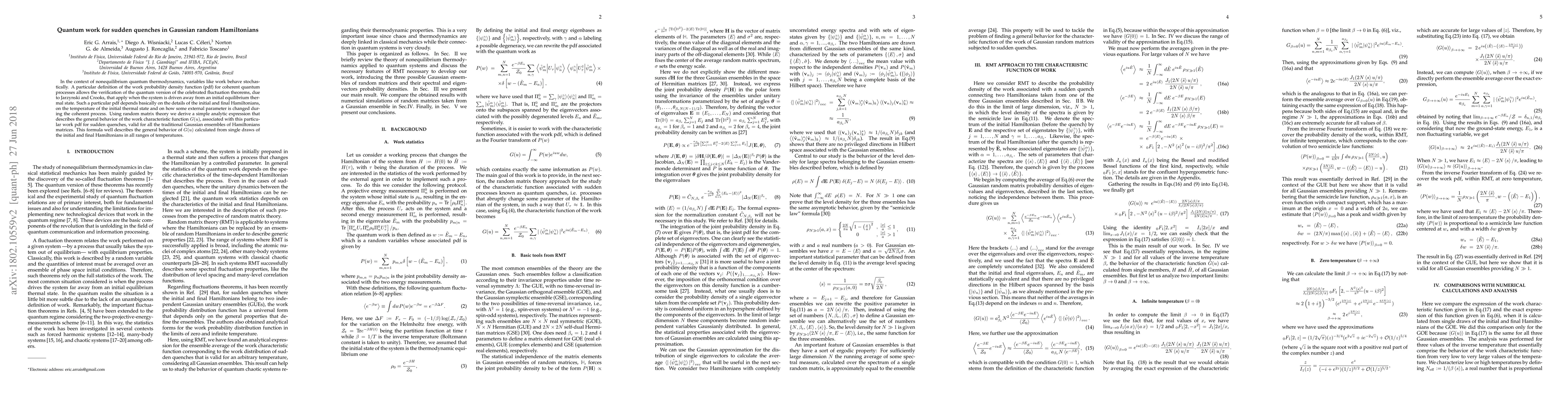 This paper derives an analytic expression for the quantum work probability density function during sudden quenches in Gaussian random Hamiltonians, verifying the quantum versions of fluctuation theorems. It uses random matrix theory to describe the general behavior of the work characteristic function $G(u)$ across various temperature ranges.