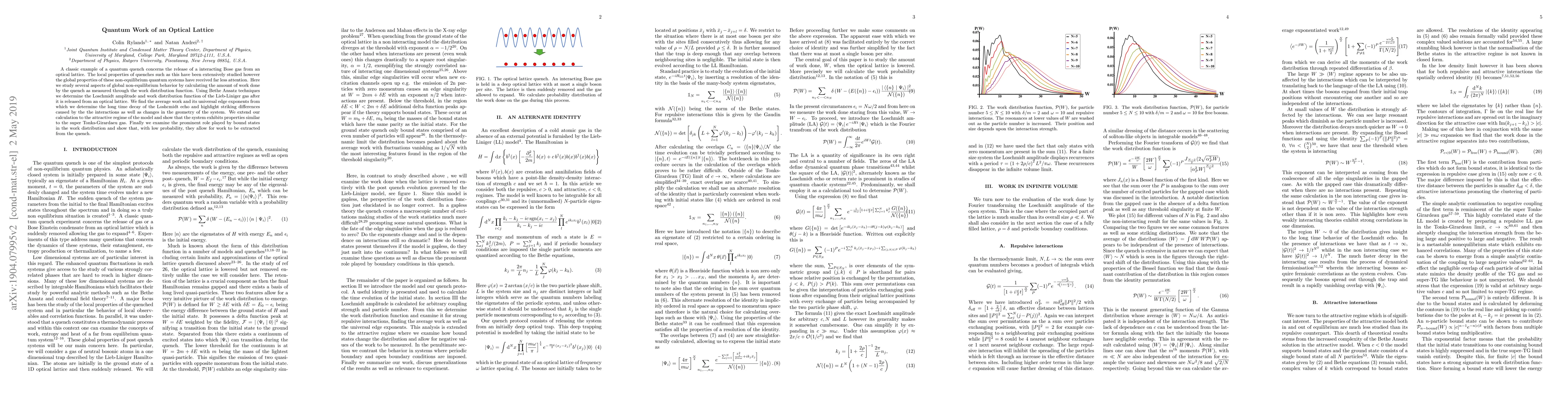 A classic example of a quantum quench concerns the release of a interacting Bose gas from an optical lattice. The local properties of quenches such as this have been extensively studied however the global properties of these non-equilibrium quantum systems have received far less attention. Here we study several aspects of global non-equilibrium behavior by calculating the amount of work done by the quench as measured through the work distribution function. Using Bethe Ansatz techniques we determine the Loschmidt amplitude and work distribution function of the Lieb-Liniger gas after it is released from an optical lattice. We find the average work and its universal edge exponents from which we determine the long time decay of the Loshcmidt echo and highlight striking differences caused by the the interactions as well as changes in the geometry of the system. We extend our calculation to the attractive regime of the model and show that the system exhibits properties similar to the super Tonks-Girardaeu gas. Finally we examine the prominent role played by bound states in the work distribution and show that, with low probability, they allow for work to be extracted from the quench.