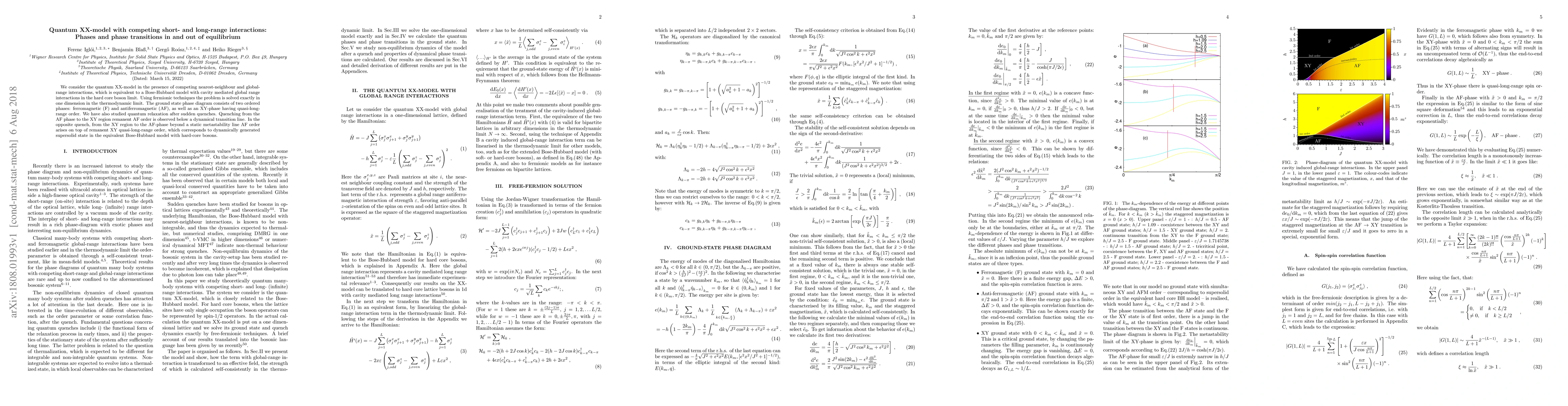 We consider the quantum XX-model in the presence of competing nearest-neighbour and global-range interactions, which is equivalent to a Bose-Hubbard model with cavity mediated global range interactions in the hard core boson limit. Using fermionic techniques the problem is solved exactly in one dimension in the thermodynamic limit. The ground state phase diagram consists of two ordered phases: ferromagnetic (F) and antiferromagnetic (AF), as well as an XY-phase having quasi-long-range order. We have also studied quantum relaxation after sudden quenches. Quenching from the AF phase to the XY region remanent AF order is observed below a dynamical transition line. In the opposite quench, from the XY region to the AF-phase beyond a static metastability line AF order arises on top of remanent XY quasi-long-range order, which corresponds to dynamically generated supersolid state in the equivalent Bose-Hubbard model with hard-core bosons.