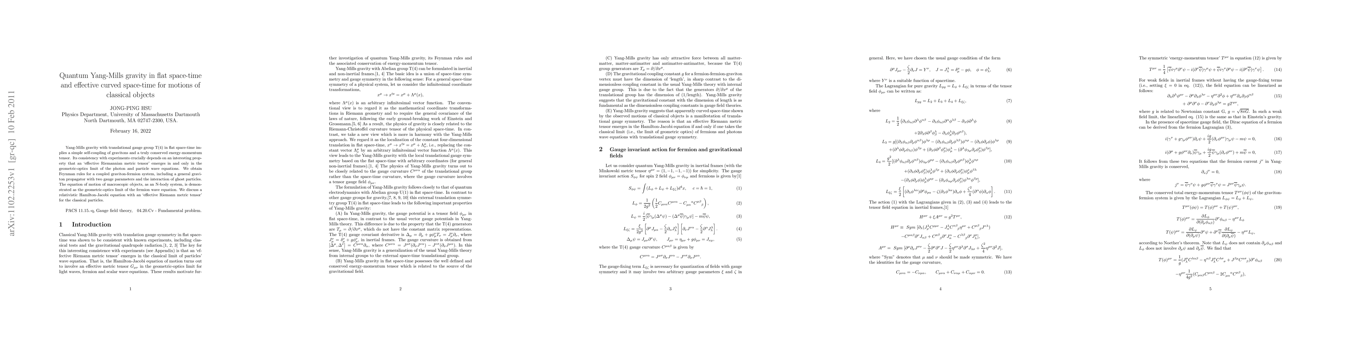 Yang-Mills gravity with translational gauge group T(4) in flat space-time implies a simple self-coupling of gravitons and a truly conserved energy-momentum tensor. Its consistency with experiments crucially depends on an interesting property that an `effective Riemannian metric tensor' emerges in and only in the geometric-optics limit of the photon and particle wave equations. We obtain Feynman rules for a coupled graviton-fermion system, including a general graviton propagator with two gauge parameters and the interaction of ghost particles. The equation of motion of macroscopic objects, as an N-body system, is demonstrated as the geometric-optics limit of the fermion wave equation. We discuss a relativistic Hamilton-Jacobi equation with an `effective Riemann metric tensor' for the classical particles.