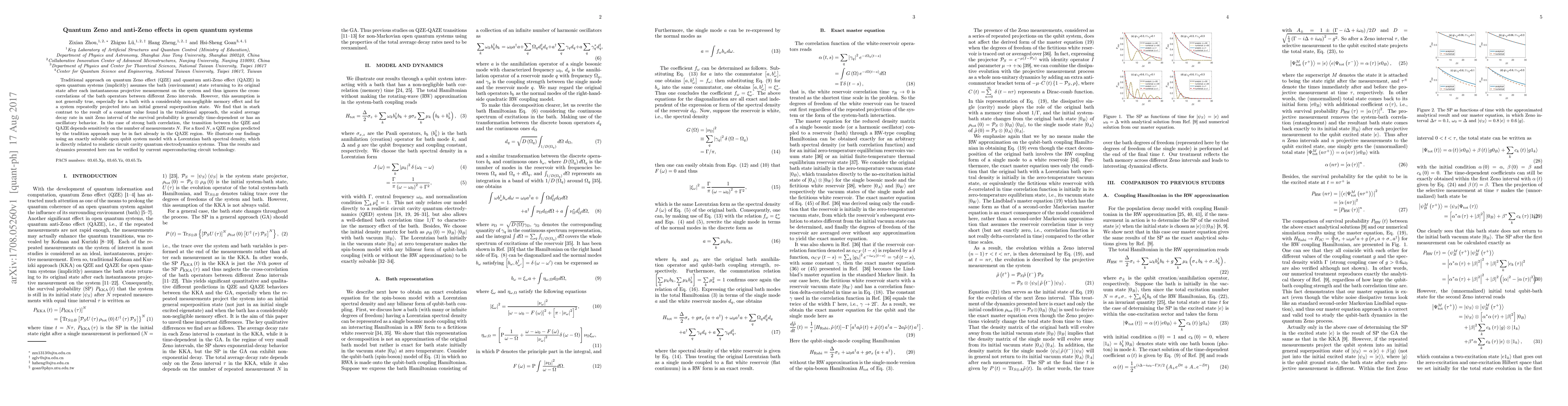 This paper investigates the quantum Zeno and anti-Zeno effects in open quantum systems, revealing that traditional assumptions about the environment's state after measurements are often invalid. It shows that the decay rate of survival probability is time-dependent or oscillatory, and the transition between Zeno effects is sensitive to the number of measurements, challenging the traditional approach.