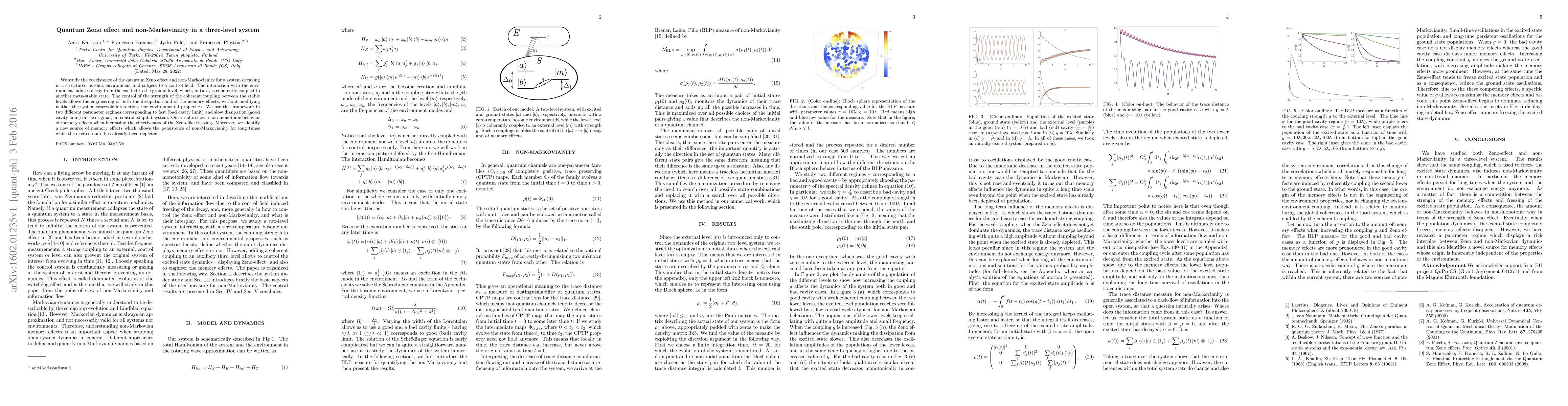This paper investigates the interplay between the quantum Zeno effect and non-Markovianity in a three-level system interacting with a structured bosonic environment, demonstrating how control over coherent coupling can engineer memory effects without altering the system-reservoir interaction. The study reveals a non-monotonic behavior of memory effects and identifies a new source of non-Markovianity persisting even after the excited state is depleted.