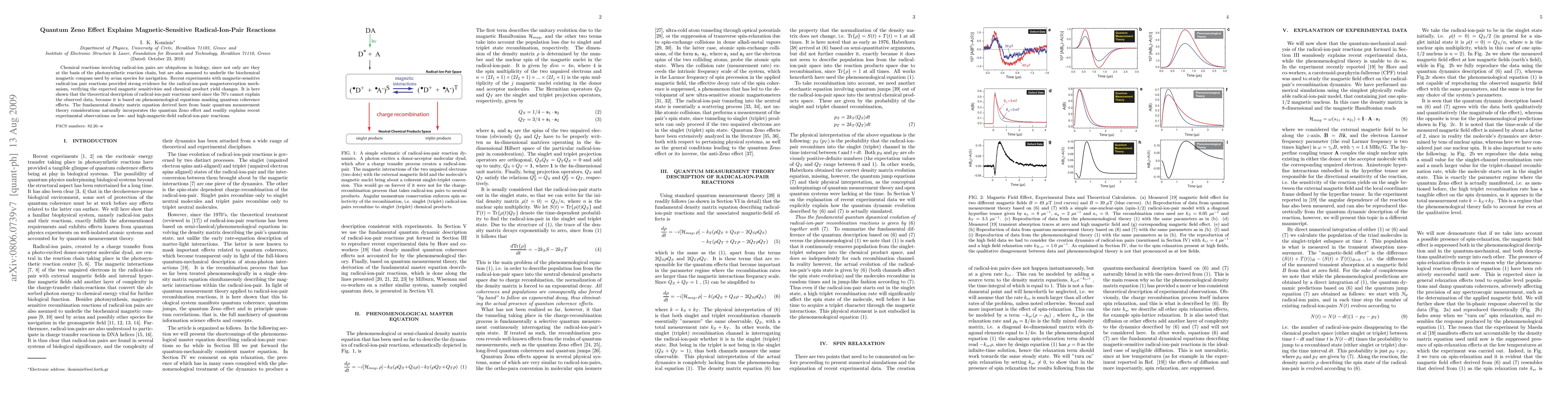 This paper explores how the quantum Zeno effect explains the behavior of magnetic-sensitive radical-ion-pair reactions, which are crucial for biological processes like photosynthesis and avian navigation. Traditional theories fail to account for recent experimental data, but a new fundamental density matrix approach incorporating quantum Zeno effects provides a satisfactory explanation.