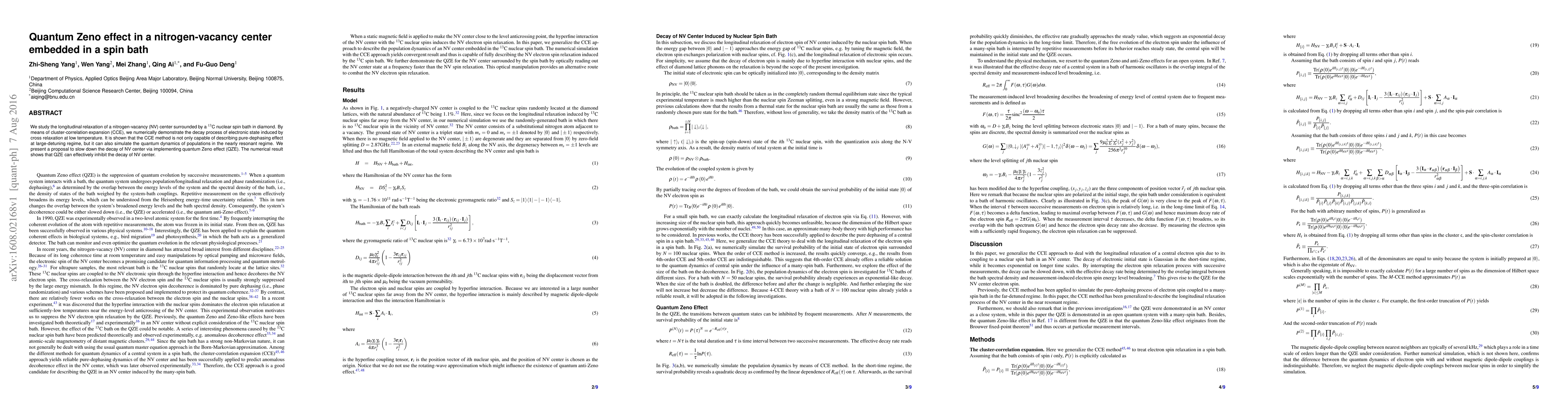 We study the longitudinal relaxation of a nitrogen-vacancy (NV) center surrounded by a $^{13}$C nuclear spin bath in diamond. By means of cluster-correlation expansion (CCE), we numerically demonstrate the decay process of electronic state induced by cross relaxation at low temperature. It is shown that the CCE method is not only capable of describing pure-dephasing effect at large-detuning regime, but it can also simulate the quantum dynamics of populations in the nearly resonant regime. We present a proposal to slow down the decay of NV center via implementing quantum Zeno effect (QZE). The numerical result shows that QZE can effectively inhibit the decay of NV center.