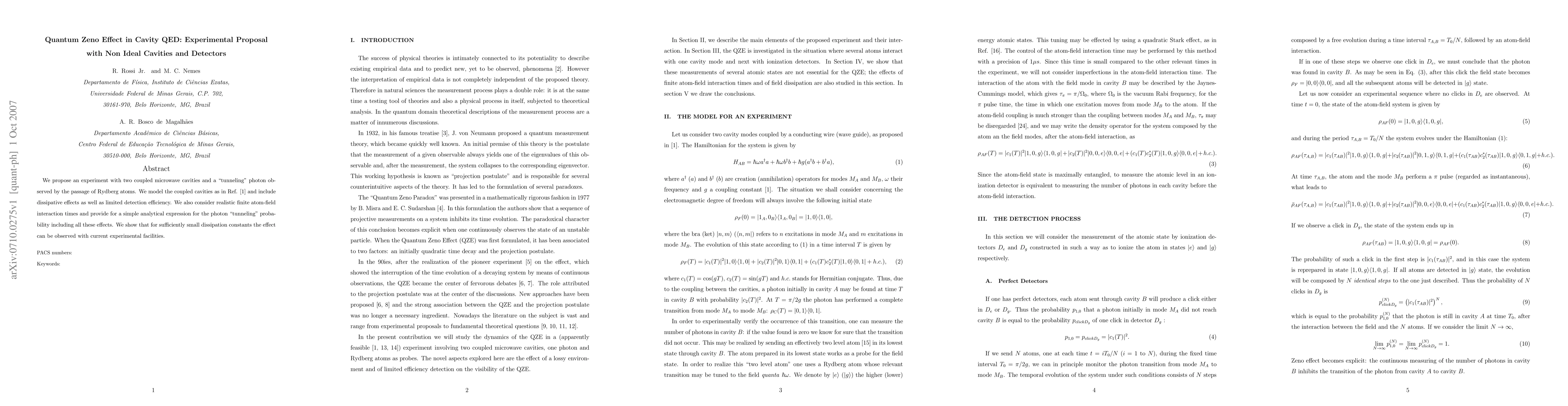 We propose an experiment with two coupled microwave cavities and a "tunneling" photon observed by the passage of Rydberg atoms. We model the coupled cavities as in Ref. \cite{art1} and include dissipative effects as well as limited detection efficiency. We also consider realistic finite atom-field interaction times and provide for a simple analytical expression for the photon "tunneling" probability including all these effects. We show that for sufficiently small dissipation constants the effect can be observed with current experimental facilities.