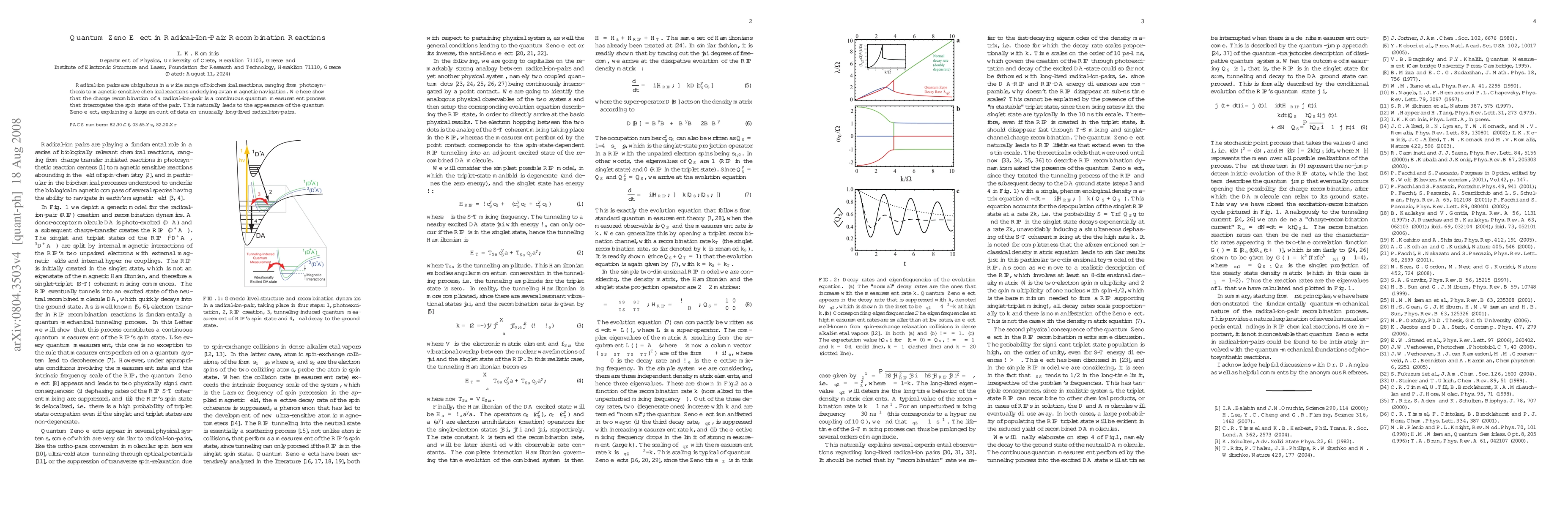This paper demonstrates that the quantum Zeno effect governs the charge recombination of radical-ion pairs, which is a continuous quantum measurement process that stabilizes the spin state, explaining the unusually long lifetimes of these pairs in biochemical reactions.
