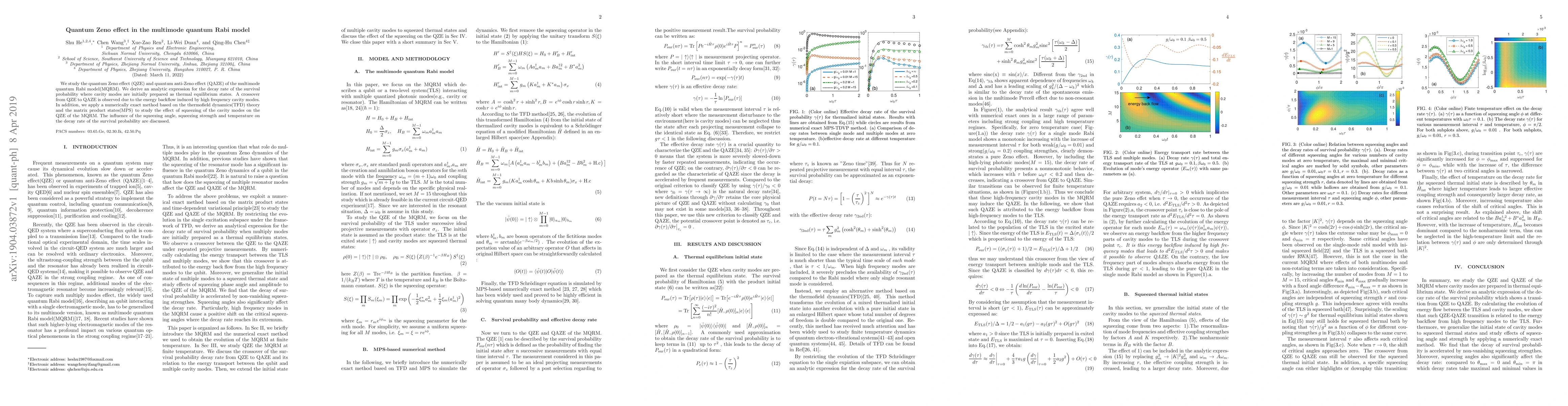 This paper investigates the quantum Zeno effect (QZE) and quantum anti-Zeno effect (QAZE) in the multimode quantum Rabi model, revealing a crossover from QZE to QAZE due to energy backflow from high-frequency cavity modes. It also explores the impact of cavity mode squeezing on the QZE using thermofield dynamics and matrix product states, analyzing the effects of squeezing angle, strength, and temperature on the survival probability decay rate.