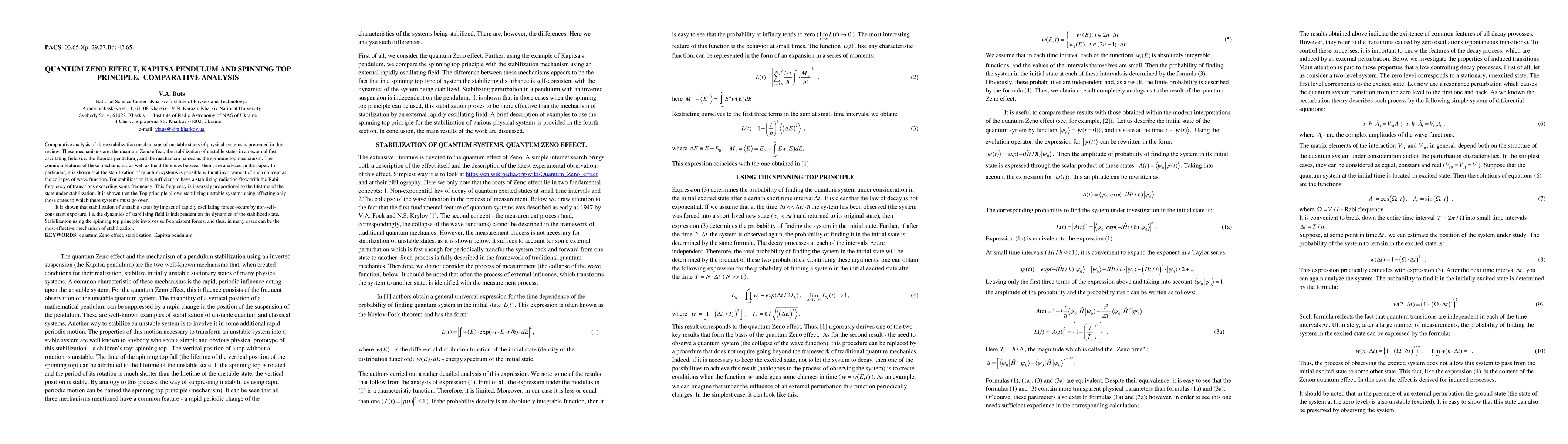 Comparative analysis of three stabilization mechanisms of unstable states of physical systems is presented in this review. These mechanisms are: the quantum Zeno effect, the stabilization of unstable states in an external fast oscillating field (i.e. the Kapitza pendulum), and the mechanism named as the spinning top mechanism. The common features of these mechanisms, as well as the differences between them, are analyzed in the paper. In particular, it is shown that the stabilization of quantum systems is possible without involvement of such concept as the collapse of wave function. For stabilization it is sufficient to have a stabilizing radiation flow with the Rabi frequency of transitions exceeding some frequency. This frequency is inversely proportional to the lifetime of the state under stabilization. It is shown that the Top principle allows stabilizing unstable systems using affecting only those states to which these systems must go over. It is shown that stabilization of unstable states by impact of rapidly oscillating forces occurs by non-self-consistent exposure, i.e. the dynamics of stabilizing field is independent on the dynamics of the stabilized state. Stabilization using the spinning top principle involves self-consistent forces, and thus, in many cases can be the most effective mechanism of stabilization.