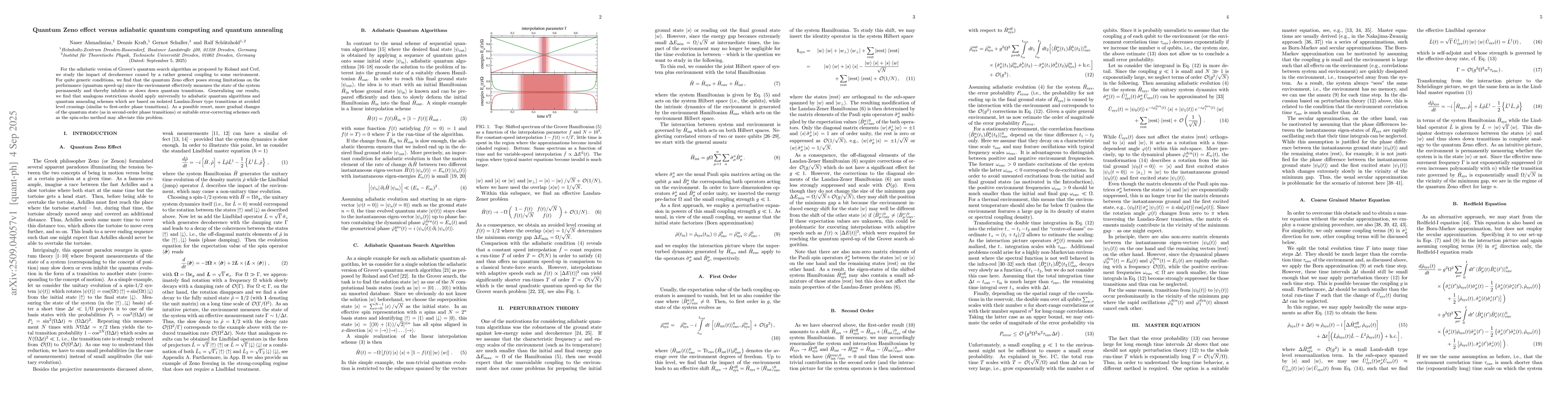 For the adiabatic version of Grover's quantum search algorithm as proposed by Roland and Cerf, we study the impact of decoherence caused by a rather general coupling to some environment. For quite generic conditions, we find that the quantum Zeno effect poses strong limitations on the performance (quantum speed-up) since the environment effectively measures the state of the system permanently and thereby inhibits or slows down quantum transitions. Generalizing our results, we find that analogous restrictions should apply universally to adiabatic quantum algorithms and quantum annealing schemes which are based on isolated Landau-Zener type transitions at avoided level crossings (similar to first-order phase transitions). As a possible resort, more gradual changes of the quantum state (as in second-order phase transitions) or suitable error-correcting schemes such as the spin-echo method may alleviate this problem.