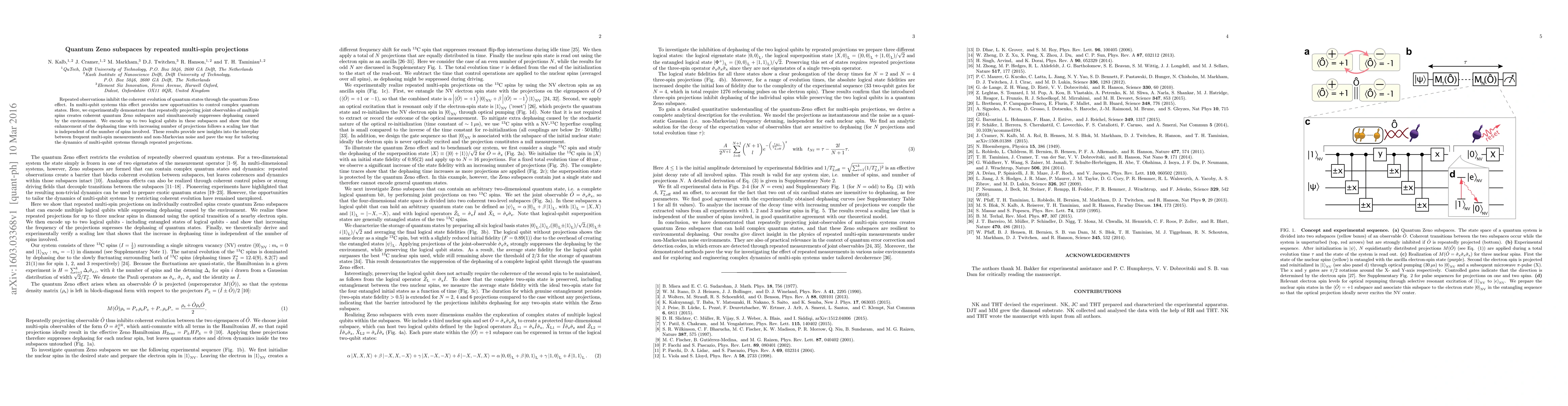 Repeated observations inhibit the coherent evolution of quantum states through the quantum Zeno effect. In multi-qubit systems this effect provides new opportunities to control complex quantum states. Here, we experimentally demonstrate that repeatedly projecting joint observables of multiple spins creates coherent quantum Zeno subspaces and simultaneously suppresses dephasing caused by the environment. We encode up to two logical qubits in these subspaces and show that the enhancement of the dephasing time with increasing number of projections follows a scaling law that is independent of the number of spins involved. These results provide new insights into the interplay between frequent multi-spin measurements and non-Markovian noise and pave the way for tailoring the dynamics of multi-qubit systems through repeated projections.