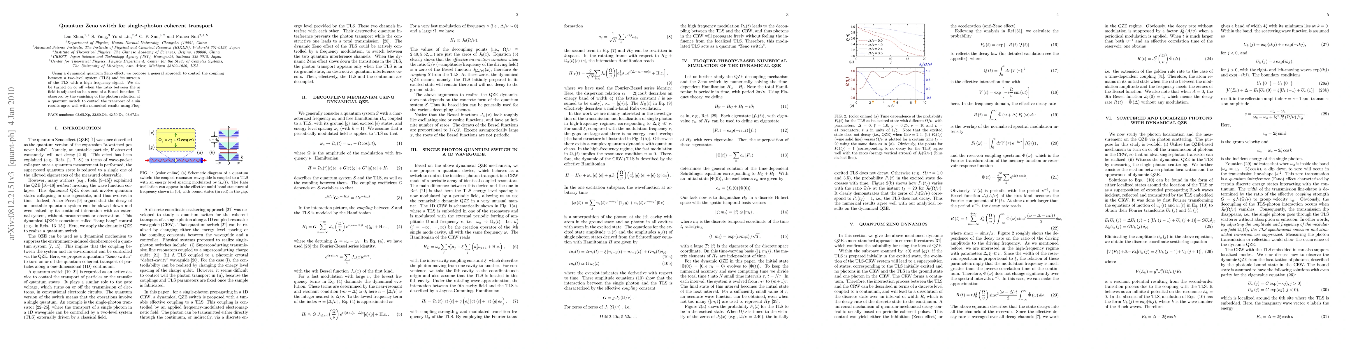 This paper proposes a quantum Zeno switch to control single-photon transport by dynamically modulating the coupling between a two-level system and its environment using a high-frequency signal. The switch operates by adjusting the modulating field's amplitude and frequency to zeros of a Bessel function, achieving on-off control of photon reflection and transport.