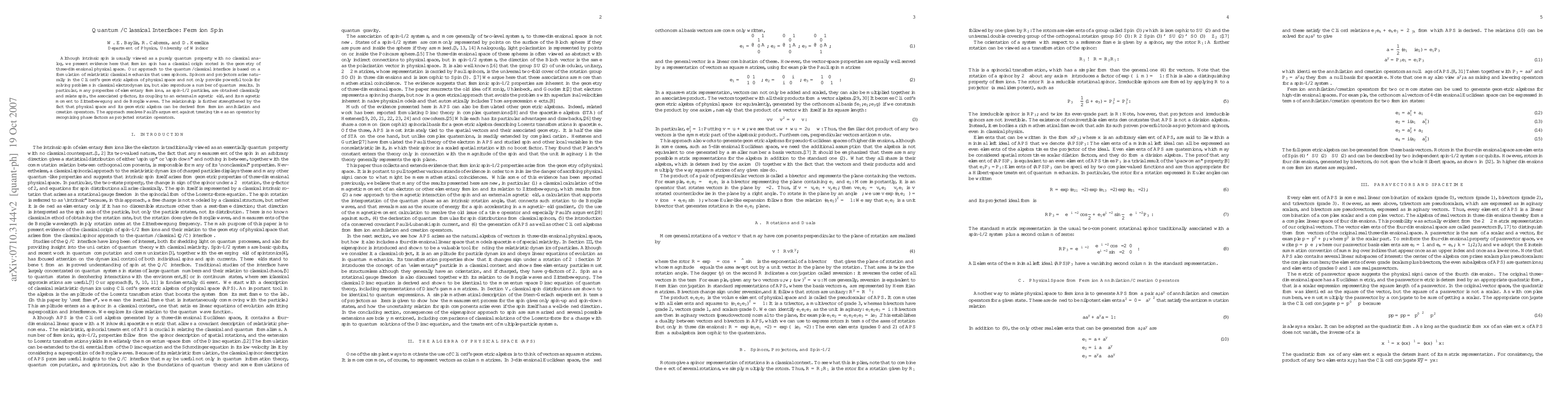 Although intrinsic spin is usually viewed as a purely quantum property with no classical analog, we present evidence here that fermion spin has a classical origin rooted in the geometry of three-dimensional physical space. Our approach to the quantum/classical interface is based on a formulation of relativistic classical mechanics that uses spinors. Spinors and projectors arise naturally in the Clifford's geometric algebra of physical space and not only provide powerful tools for solving problems in classical electrodynamics, but also reproduce a number of quantum results. In particular, many properites of elementary fermions, as spin-1/2 particles, are obtained classically and relate spin, the associated g-factor, its coupling to an external magnetic field, and its magnetic moment to Zitterbewegung and de Broglie waves. The relationship is further strengthened by the fact that physical space and its geometric algebra can be derived from fermion annihilation and creation operators. The approach resolves Pauli's argument against treating time as an operator by recognizing phase factors as projected rotation operators.