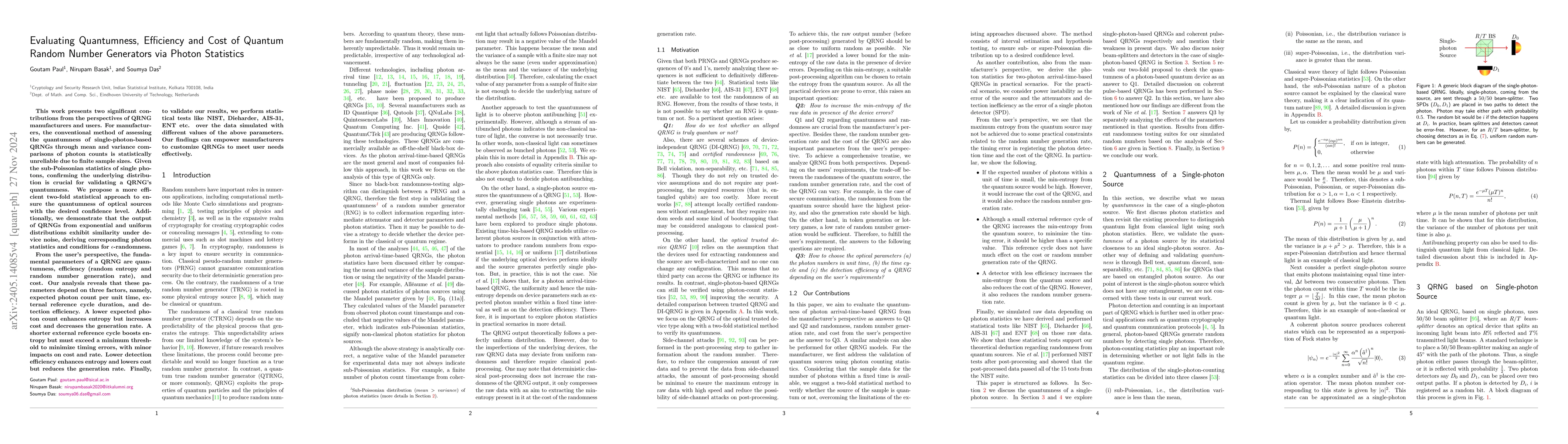 Several quantum random number generator (QRNG) models have been proposed to produce random numbers, which, due to the quantum theory, are more secure than their classical counterparts. Many QRNG devices are commercially available as off-the-shelf black-box devices. Computationally, it is not possible to distinguish between a PRNG and a QRNG just by observing their outputs. The common practice for testing quantumness is a direct comparison between the mean and the variance of the experimental photon count. However, statistically, this is not a feasible solution either, because of finite sample size. A QRNG that uses single photons as the quantum source produces true quantum random numbers. Since single photons follow sub-Poissonian statistics, by determining the underlying distribution one can conclude whether a QRNG is truly quantum or not. In this work, we point out the limitations of existing methods of such a decision-making processes, and propose a more efficient two-fold statistical method, which can ensure whether an optical source is quantum or not up to a desired confidence level. Also, QRNGs can not produce true random numbers without deterministic classical post-processing. In this work, we also show that the two models of QRNGs, one producing random numbers from exponential distribution and the other from uniform distribution, become essentially similar under device noise. Detector outputs of both the above models can be tested to quantify the randomness coming from the quantum source of a QRNG, which in turn, dictates how much post-processing is required to produce good random numbers retaining quantumness. In this context, we also derive a relation when the underlying sampling distributions of the QRNGs will be $\epsilon$-random. Depending on this relation, a suitable post-processing algorithm can be chosen.