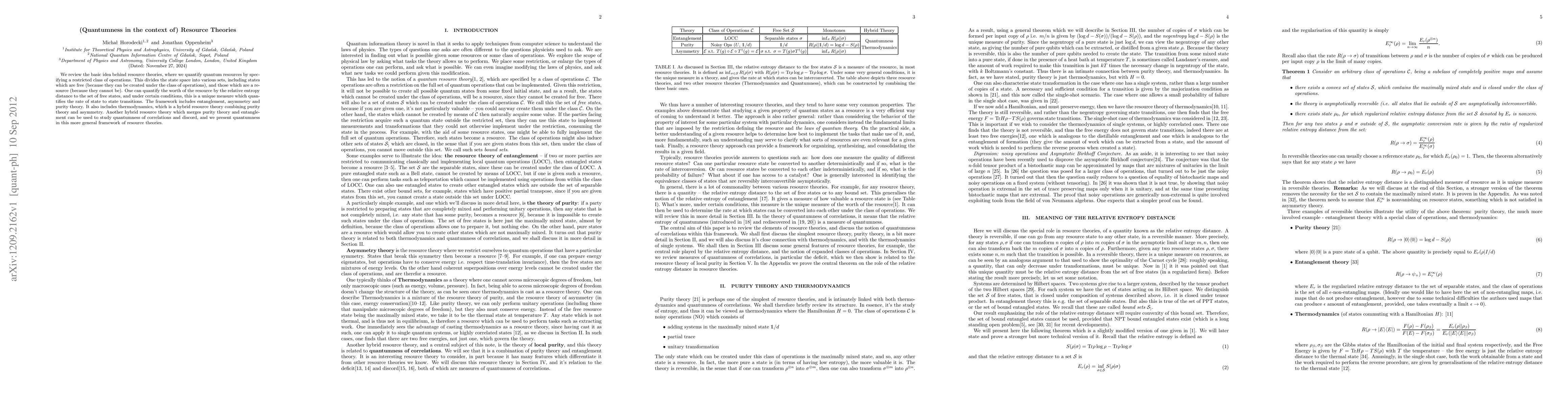 This paper reviews resource theories that quantify quantum resources by classifying states into free and resource states, with quantumness measured by relative entropy distance. It explores hybrid theories combining purity, entanglement, and asymmetry, and discusses quantumness within this broader framework.