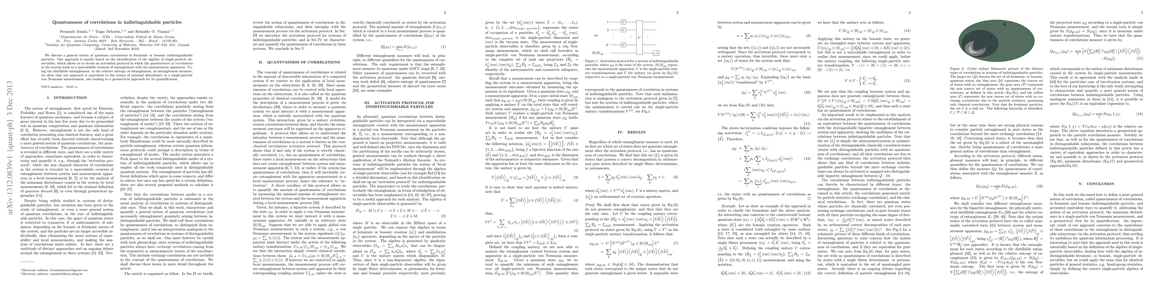 The paper presents an activation protocol for indistinguishable particles, linking the quantumness of correlations to distinguishable bipartite entanglement between system and apparatus, and offers a geometrical approach for characterizing and quantifying correlations between indistinguishable particles.