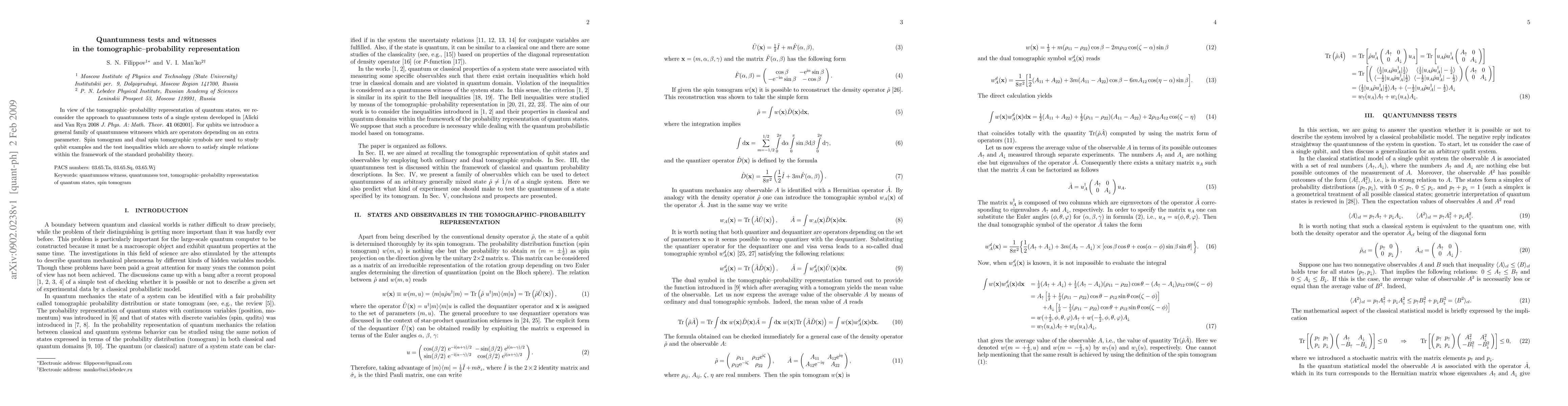 This paper introduces a new family of quantumness witnesses for qubits in the tomographic-probability representation, extending previous work by Alicki and Van Ryn. The study utilizes spin tomograms and dual spin tomographic symbols to explore test inequalities that align with standard probability theory.