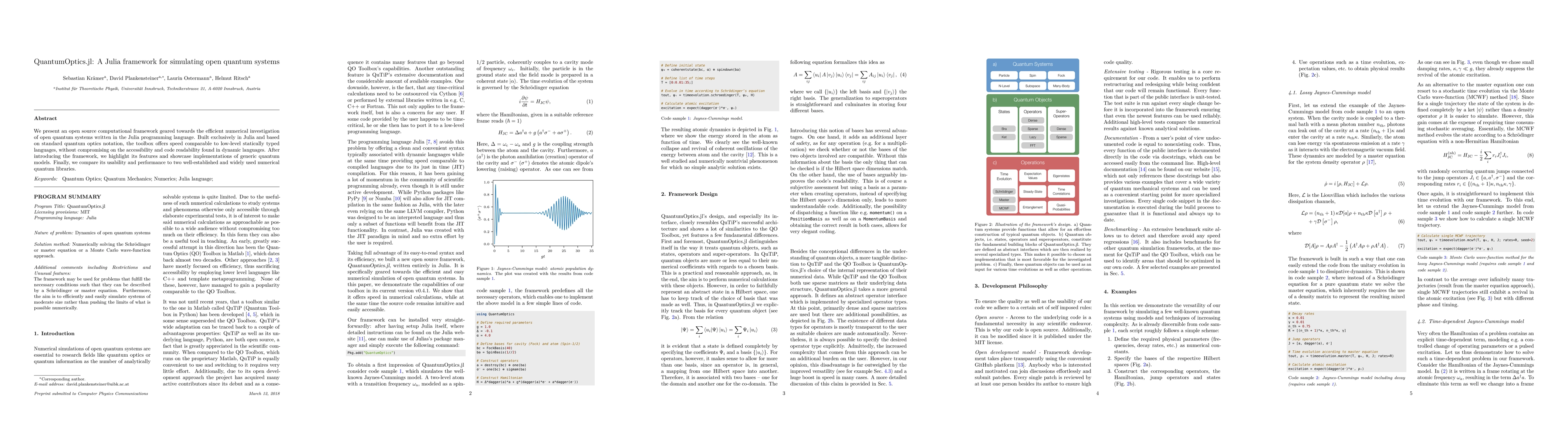 QuantumOptics.jl is a Julia-based framework for simulating open quantum systems, offering high performance and readability. It is compared to other numerical quantum libraries, demonstrating its usability and competitive speed.