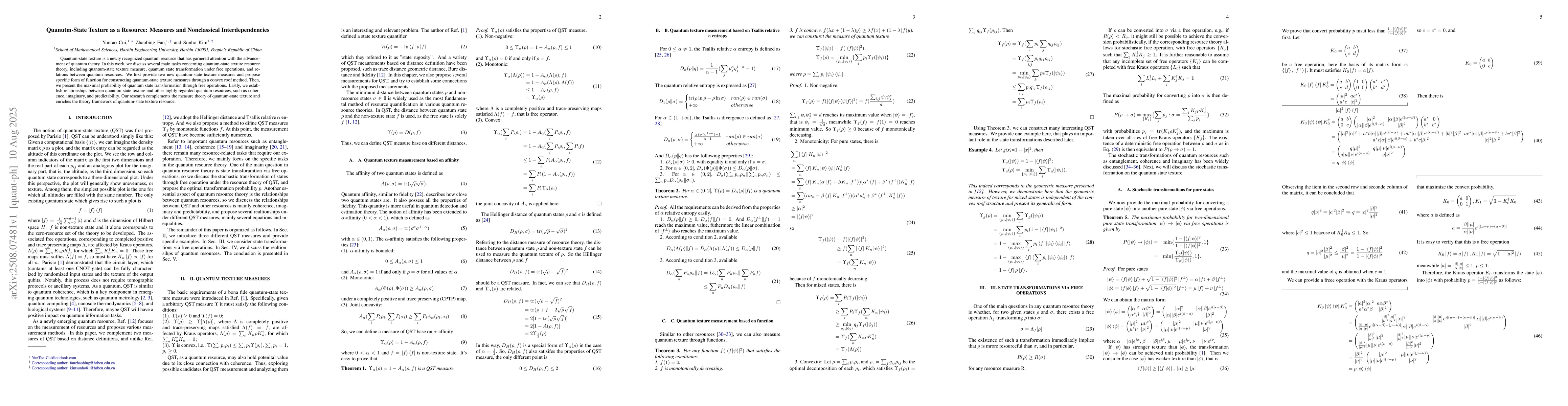 Quantum-state texture is a newly recognized quantum resource that has garnered attention with the advancement of quantum theory. In this work, we discuss several main tasks concerning quantum-state texture resource theory, including quantum-state texture measure, quantum state transformation under free operations, and relations between quantum resources. We first provide two new quantum-state texture measures and propose specific form of function for constructing quantum-state texture measures through a convex roof method. Then, we present the maximal probability of quantum state transformation through free operations. Lastly, we establish relationships between quantum-state texture and other highly regarded quantum resources, such as coherence, imaginary, and predictability. Our research complements the measure theory of quantum-state texture and enriches the theory framework of quantum-state texture resource.