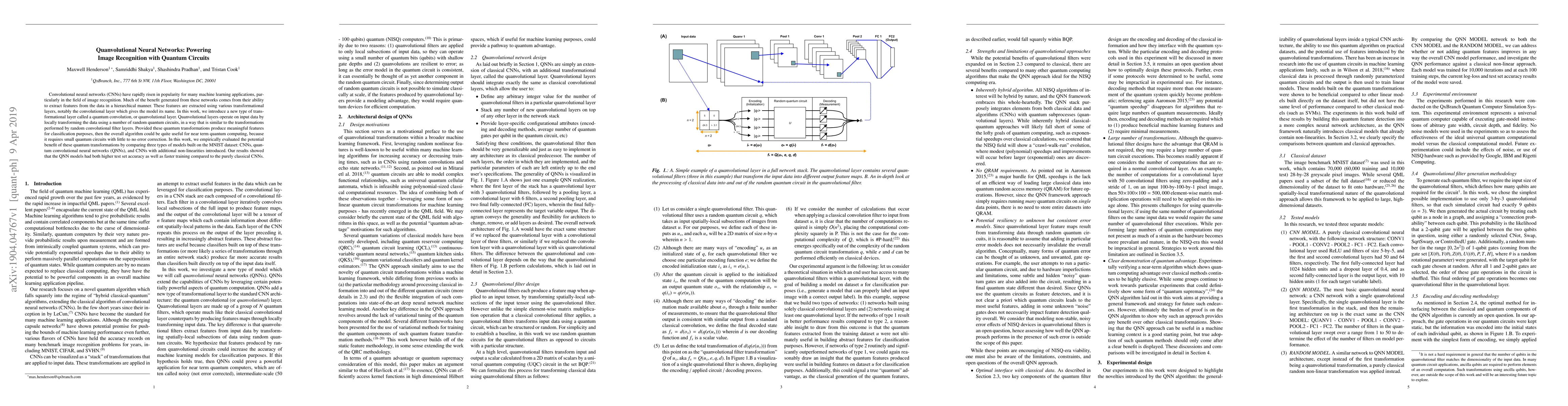 Convolutional neural networks (CNNs) have rapidly risen in popularity for many machine learning applications, particularly in the field of image recognition. Much of the benefit generated from these networks comes from their ability to extract features from the data in a hierarchical manner. These features are extracted using various transformational layers, notably the convolutional layer which gives the model its name. In this work, we introduce a new type of transformational layer called a quantum convolution, or quanvolutional layer. Quanvolutional layers operate on input data by locally transforming the data using a number of random quantum circuits, in a way that is similar to the transformations performed by random convolutional filter layers. Provided these quantum transformations produce meaningful features for classification purposes, then the overall algorithm could be quite useful for near term quantum computing, because it requires small quantum circuits with little to no error correction. In this work, we empirically evaluated the potential benefit of these quantum transformations by comparing three types of models built on the MNIST dataset: CNNs, quantum convolutional neural networks (QNNs), and CNNs with additional non-linearities introduced. Our results showed that the QNN models had both higher test set accuracy as well as faster training compared to the purely classical CNNs.