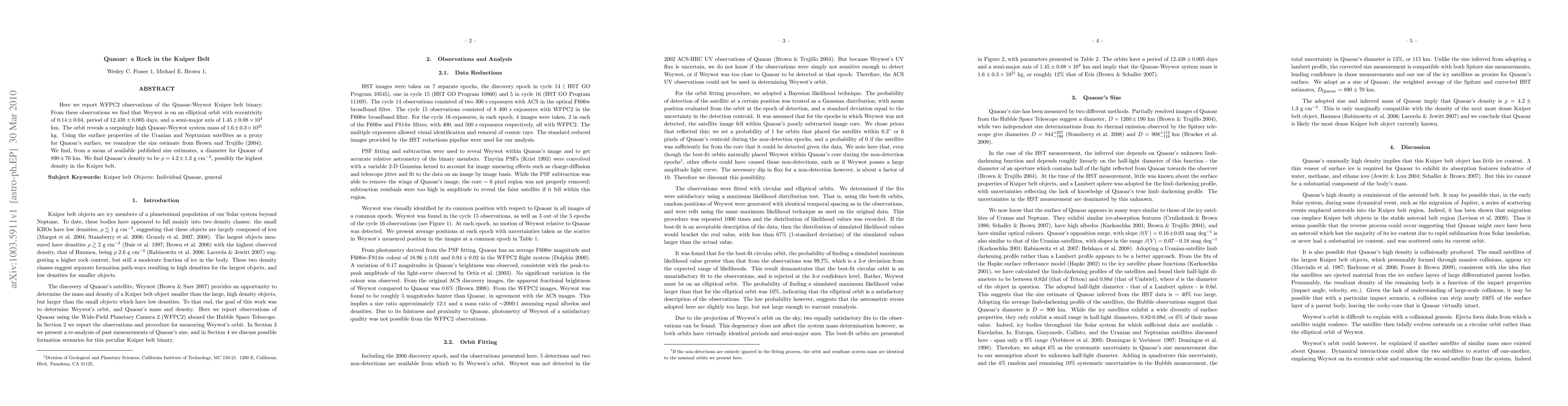 This paper reports WFPC2 observations of Quaoar's binary companion Weywot, revealing an elliptical orbit with a high system mass and a Quaoar diameter of 890 ± 70 km, suggesting it has the highest density among Kuiper belt objects at 4.2 ± 1.3 g cm^-3.