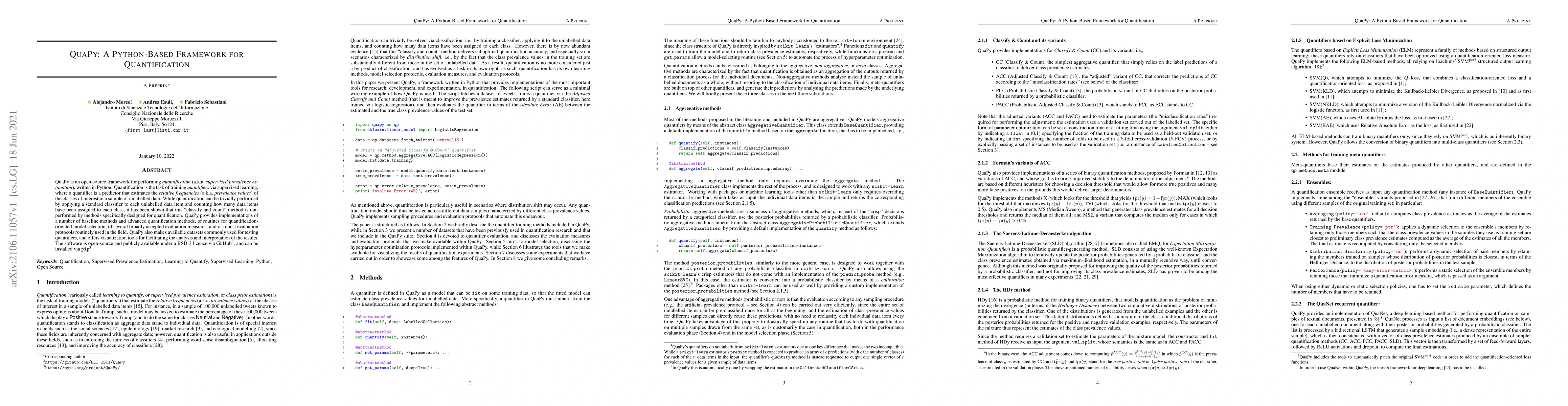 QuaPy is an open-source framework for performing quantification (a.k.a. supervised prevalence estimation), written in Python. Quantification is the task of training quantifiers via supervised learning, where a quantifier is a predictor that estimates the relative frequencies (a.k.a. prevalence values) of the classes of interest in a sample of unlabelled data. While quantification can be trivially performed by applying a standard classifier to each unlabelled data item and counting how many data items have been assigned to each class, it has been shown that this "classify and count" method is outperformed by methods specifically designed for quantification. QuaPy provides implementations of a number of baseline methods and advanced quantification methods, of routines for quantification-oriented model selection, of several broadly accepted evaluation measures, and of robust evaluation protocols routinely used in the field. QuaPy also makes available datasets commonly used for testing quantifiers, and offers visualization tools for facilitating the analysis and interpretation of the results. The software is open-source and publicly available under a BSD-3 licence via https://github.com/HLT-ISTI/QuaPy, and can be installed via pip (https://pypi.org/project/QuaPy/)