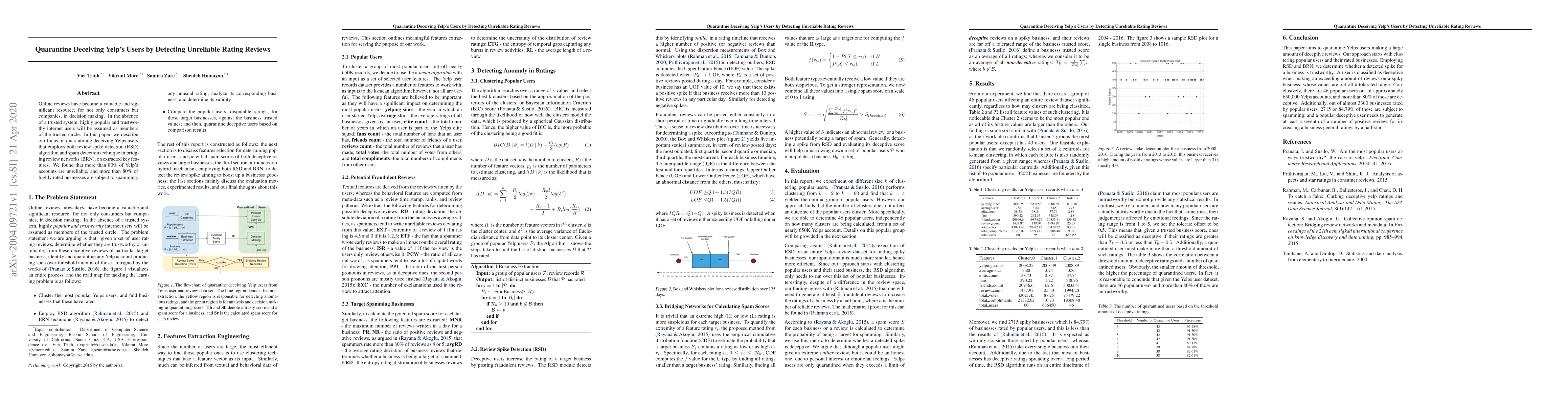 Online reviews have become a valuable and significant resource, for not only consumers but companies, in decision making. In the absence of a trusted system, highly popular and trustworthy internet users will be assumed as members of the trusted circle. In this paper, we describe our focus on quarantining deceiving Yelp's users that employ both review spike detection (RSD) algorithm and spam detection technique in bridging review networks (BRN), on extracted key features. We found that more than 80% of Yelp's accounts are unreliable, and more than 80% of highly-rated businesses are subject to spamming.