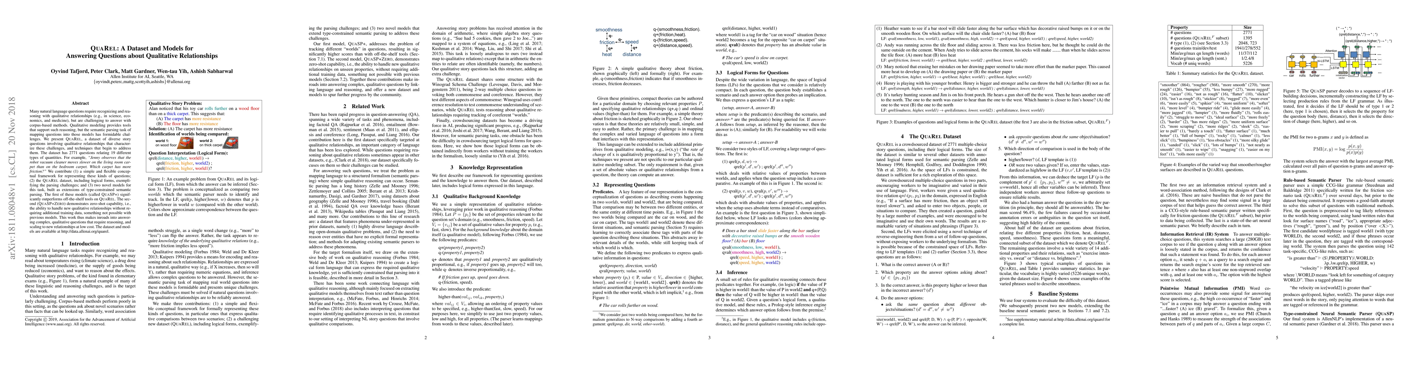 Many natural language questions require recognizing and reasoning with qualitative relationships (e.g., in science, economics, and medicine), but are challenging to answer with corpus-based methods. Qualitative modeling provides tools that support such reasoning, but the semantic parsing task of mapping questions into those models has formidable challenges. We present QuaRel, a dataset of diverse story questions involving qualitative relationships that characterize these challenges, and techniques that begin to address them. The dataset has 2771 questions relating 19 different types of quantities. For example, "Jenny observes that the robot vacuum cleaner moves slower on the living room carpet than on the bedroom carpet. Which carpet has more friction?" We contribute (1) a simple and flexible conceptual framework for representing these kinds of questions; (2) the QuaRel dataset, including logical forms, exemplifying the parsing challenges; and (3) two novel models for this task, built as extensions of type-constrained semantic parsing. The first of these models (called QuaSP+) significantly outperforms off-the-shelf tools on QuaRel. The second (QuaSP+Zero) demonstrates zero-shot capability, i.e., the ability to handle new qualitative relationships without requiring additional training data, something not possible with previous models. This work thus makes inroads into answering complex, qualitative questions that require reasoning, and scaling to new relationships at low cost. The dataset and models are available at http://data.allenai.org/quarel.