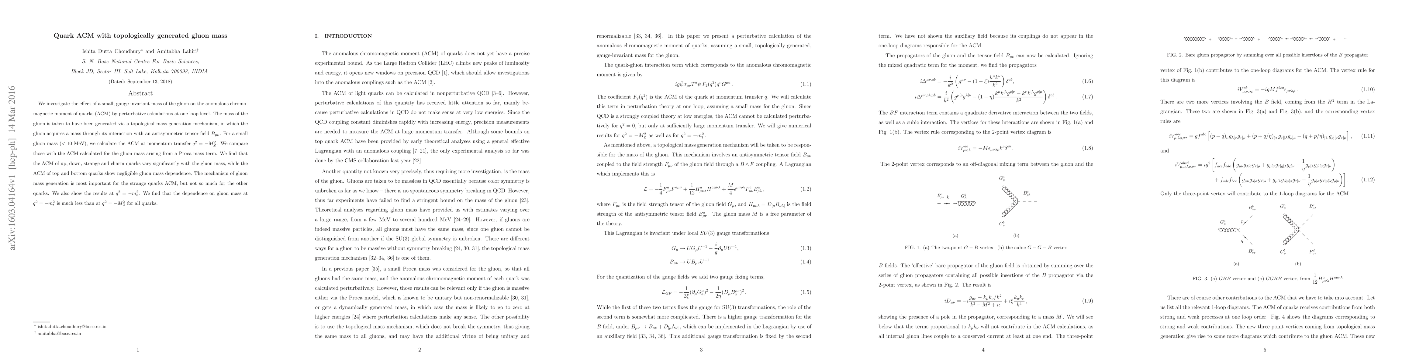 We investigate the effect of a small, gauge-invariant mass of the gluon on the anomalous chromomagnetic moment of quarks (ACM) by perturbative calculations at one loop level. The mass of the gluon is taken to have been generated via a topological mass generation mechanism, in which the gluon acquires a mass through its interaction with an antisymmetric tensor field $B_{\mu \nu}$. For a small gluon mass $(<10$ MeV), we calculate the ACM at momentum transfer $q^2=-M_Z^2$. We compare those with the ACM calculated for the gluon mass arising from a Proca mass term. We find that the ACM of up, down, strange and charm quarks vary significantly with the gluon mass, while the ACM of top and bottom quarks show negligible gluon mass dependence. The mechanism of gluon mass generation is most important for the strange quarks ACM, but not so much for the other quarks. We also show the results at $q^2=-m_t^2$. We find that the dependence on gluon mass at $q^2=-m_t^2$ is much less than at $q^2=-M_Z^2$ for all quarks.