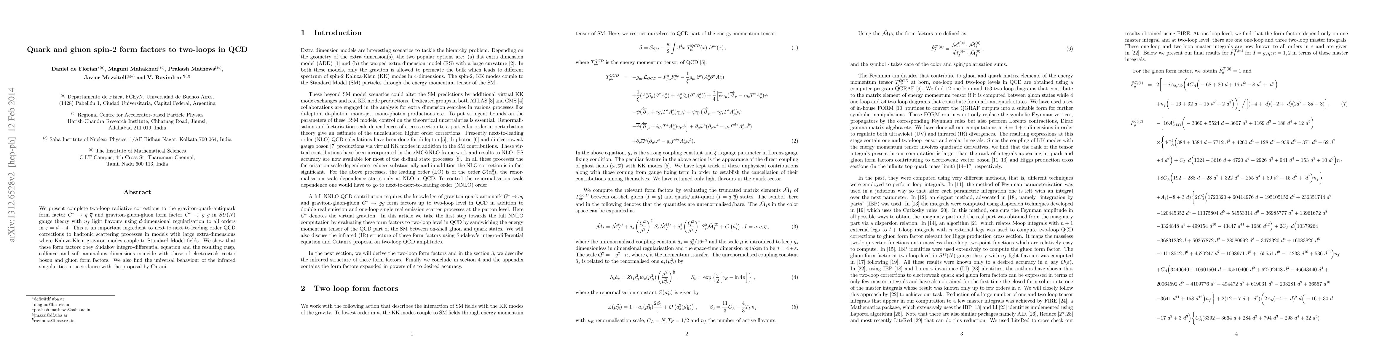 We present complete two-loop radiative corrections to the graviton-quark-antiquark form factor G^* \rightarrow q \overline q and graviton-gluon-gluon form factor G^* \rightarrow g g in SU(N) gauge theory with n_f light flavours using d-dimensional regularisation to all orders in \varepsilon=d-4. This is an important ingredient to next-to-next-to-leading order QCD corrections to hadronic scattering processes in models with large extra-dimensions where Kaluza-Klein graviton modes couple to Standard Model fields. We show that these form factors obey Sudakov integro-differential equation and the resulting cusp, collinear and soft anomalous dimensions coincide with those of electroweak vector boson and gluon form factors. We also find the universal behaviour of the infrared singularities in accordance with the proposal by Catani.