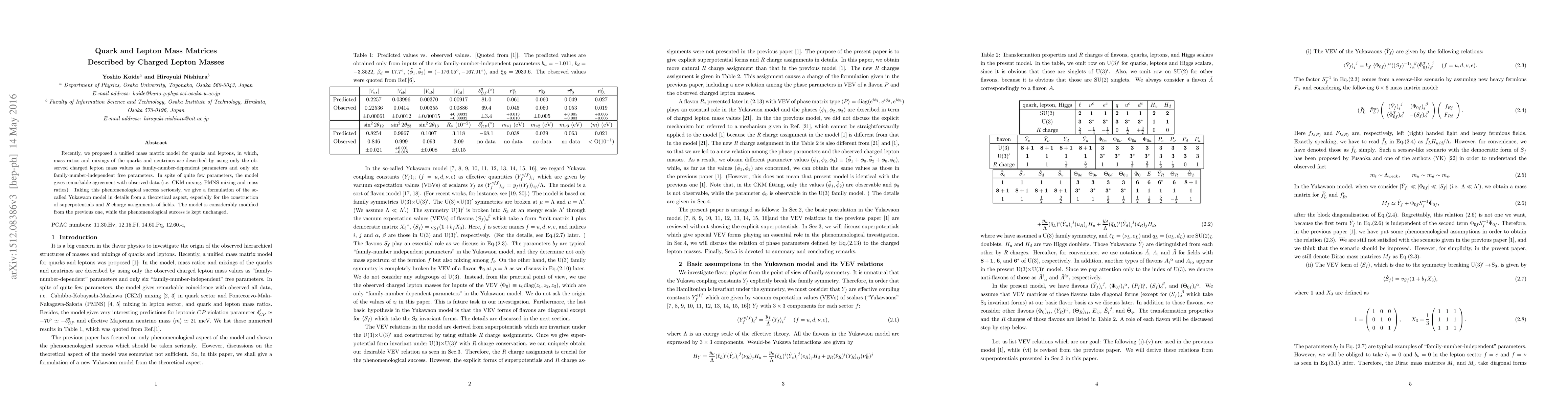 Recently, we proposed a unified mass matrix model for quarks and leptons, in which, mass ratios and mixings of the quarks and neutrinos are described by using only the observed charged lepton mass values as family-number-dependent parameters and only six family-number-independent free parameters. In spite of quite few parameters, the model gives remarkable agreement with observed data (i.e. CKM mixing, PMNS mixing and mass ratios). Taking this phenomenological success seriously, we give a formulation of the so-called Yukawaon model in details from a theoretical aspect, especially for the construction of superpotentials and $R$ charge assignments of fields. The model is considerably modified from the previous one, while the phenomenological success is kept unchanged.